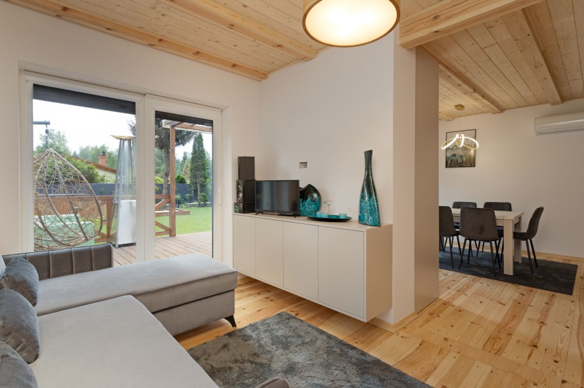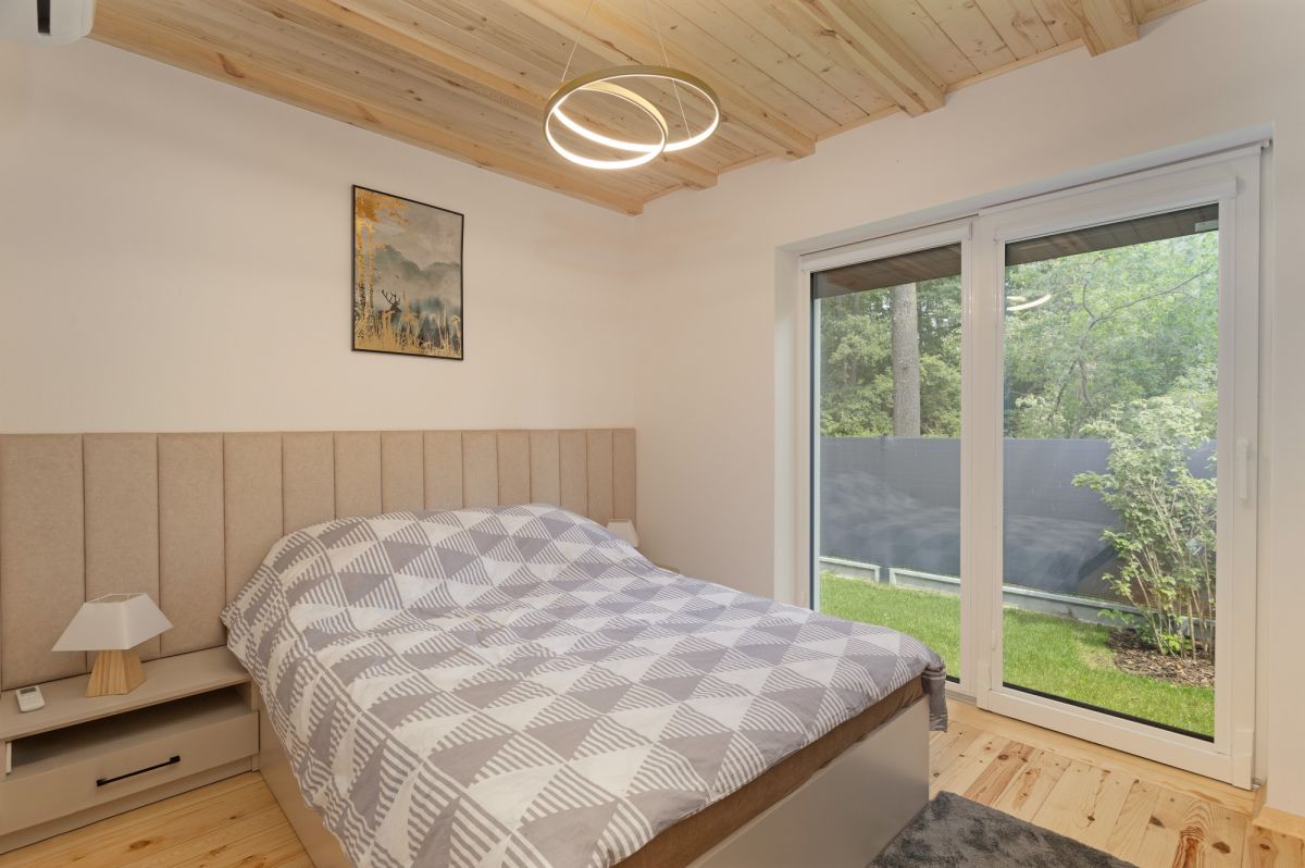 inteligentnym wyposażeniem, w tym najnowsze technologie dla komfortu codziennego życia. Dom jest idealnym miejscem zarówno na całoroczny pobyt, jak i na spokojny wypoczynek. Usytuowany jest na przestronnej działce, na której znajduje się duży ogród z sauną i balią, miejscem do grillowania oraz tarasem z meblami wypoczynkowymi
