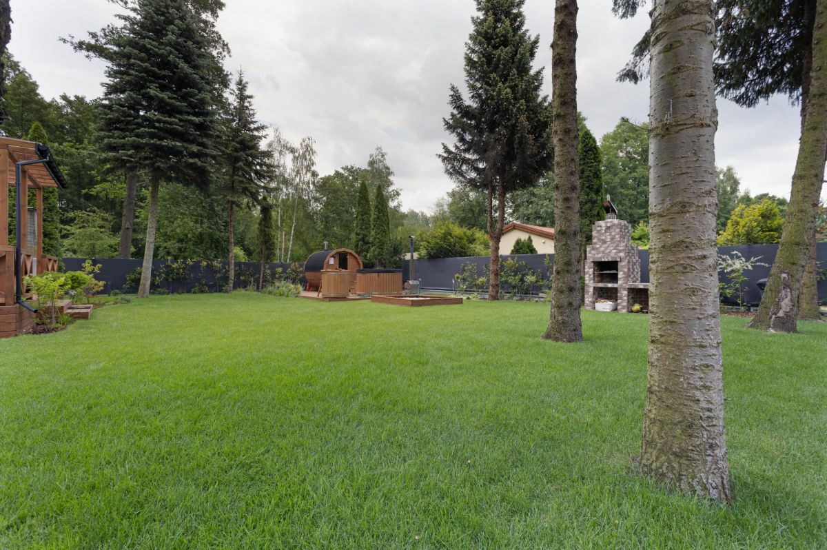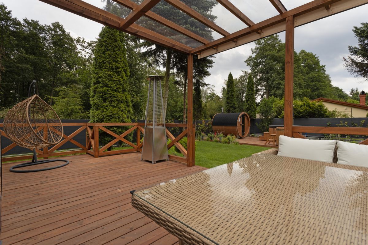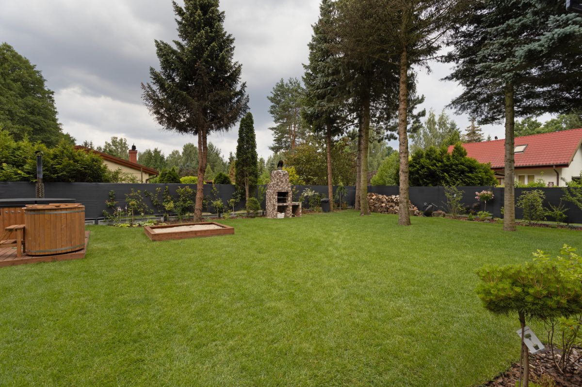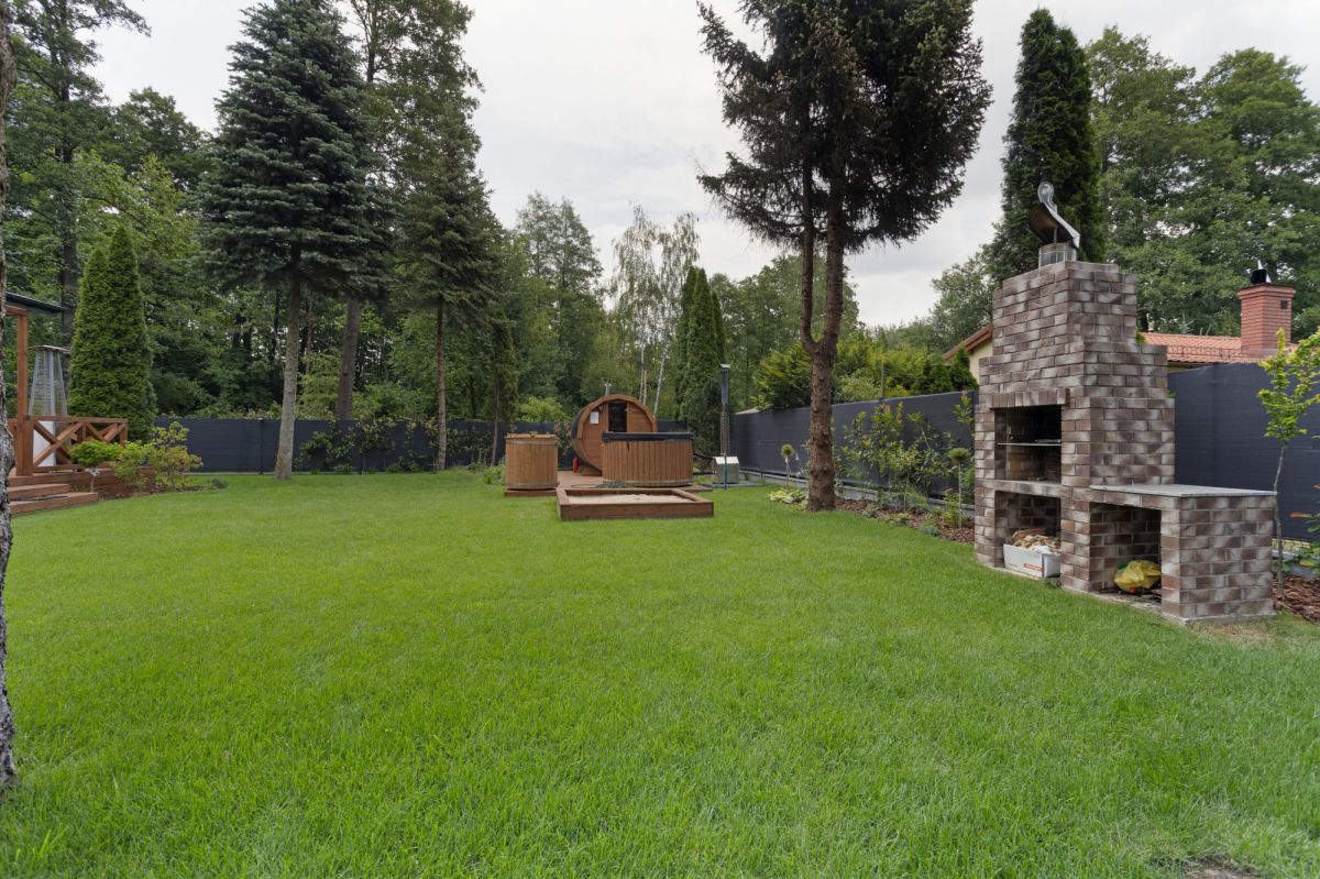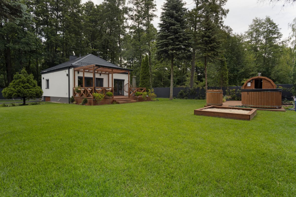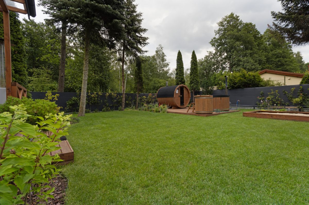 sauna i balia, miejsce do grillowania, taras z meblami wypoczynkowymi oraz plac zabaw dla dzieci. Ogród obsługiwany jest przez system