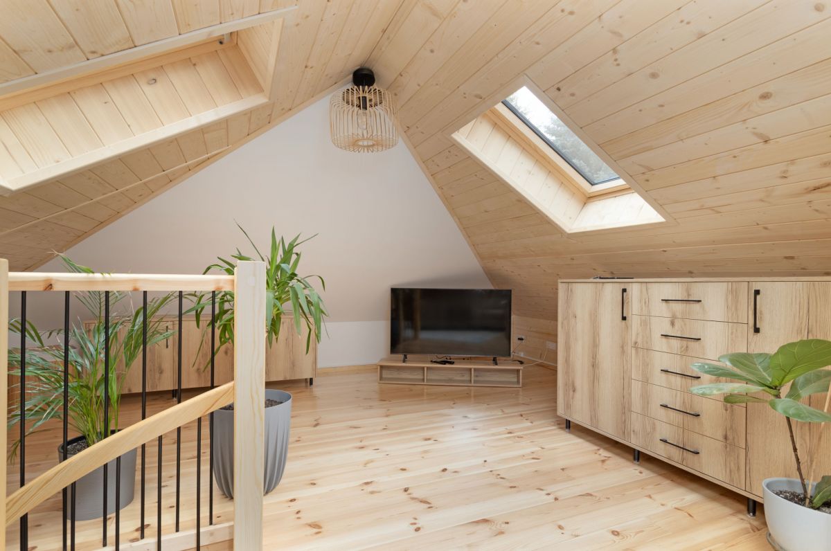 - Przestronna strefa wypoczynkowa zaaranżowana na dodatkowy pokój z wygodna kanapą i telewizorem