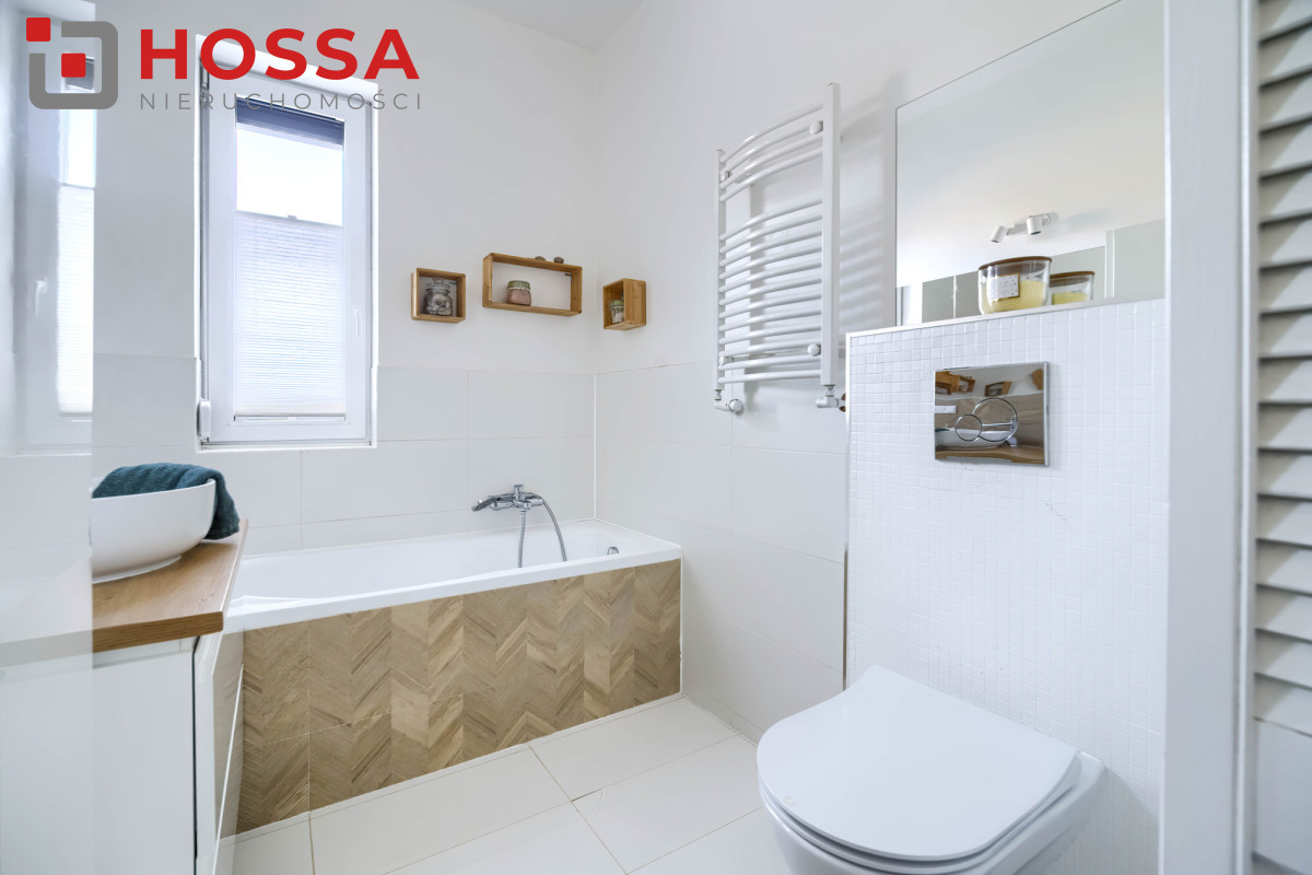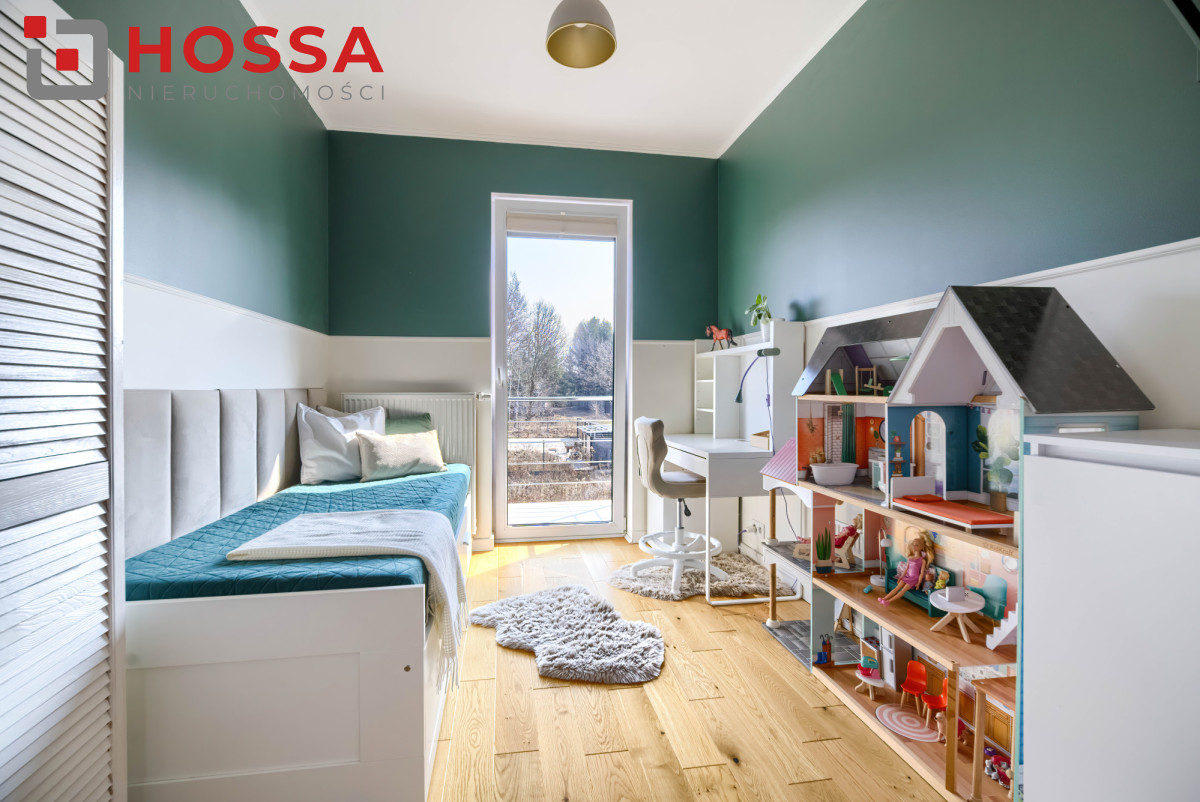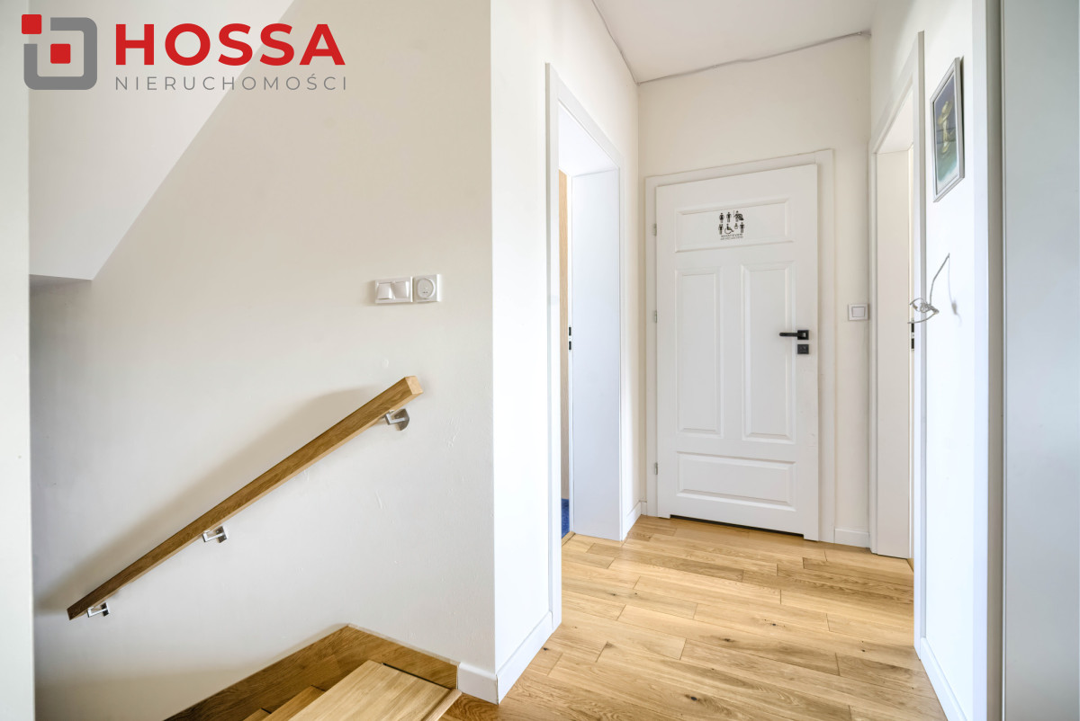 Standard i wyposażenie: dębowe schody, rolety wewnętrzne w całym domu, rolety blackout w sypialniach i na poddaszu, rolety zewnętrzne w salonie, dolnej łazience i pokojach z balkonem, monitoring (3 kamery z podglądem w aplikacji), klimatyzacja na poddaszu, piec gazowy dwufunkcyjny, ogrzewanie podłogowe w wybranych pomieszczeniach. Dodatkowym atutem jest brak czynszu i opłat administracyjnych. Narożne położenie zapewnia większą ilość światła oraz prywatności.