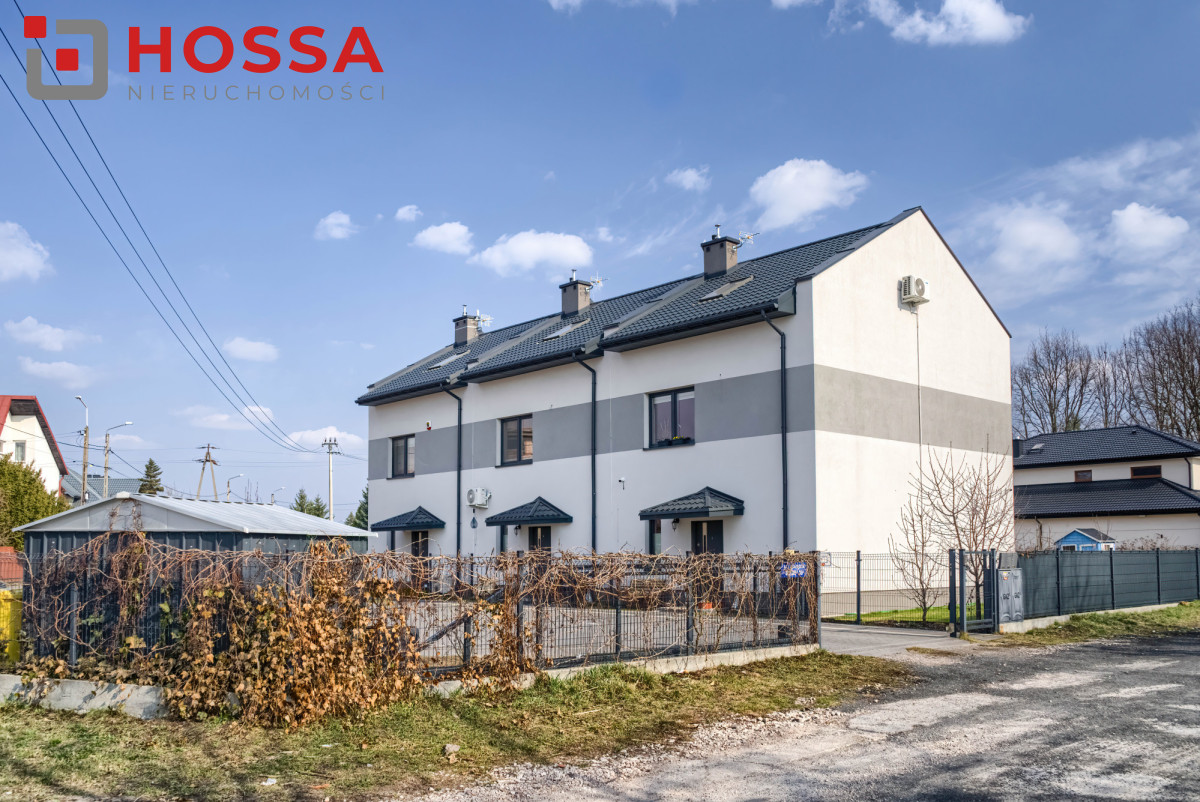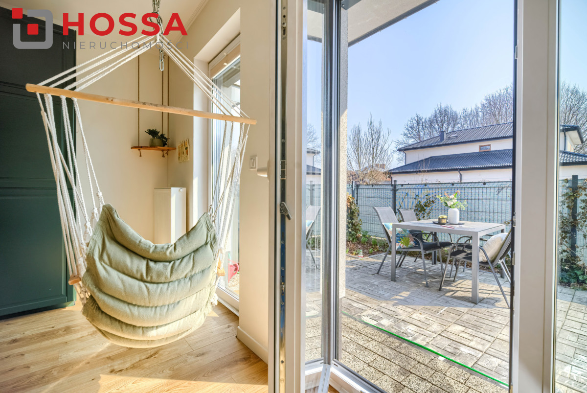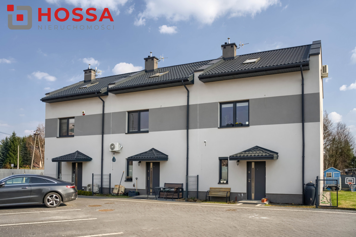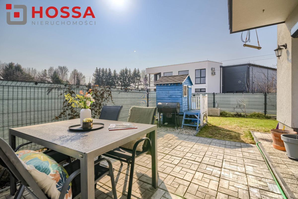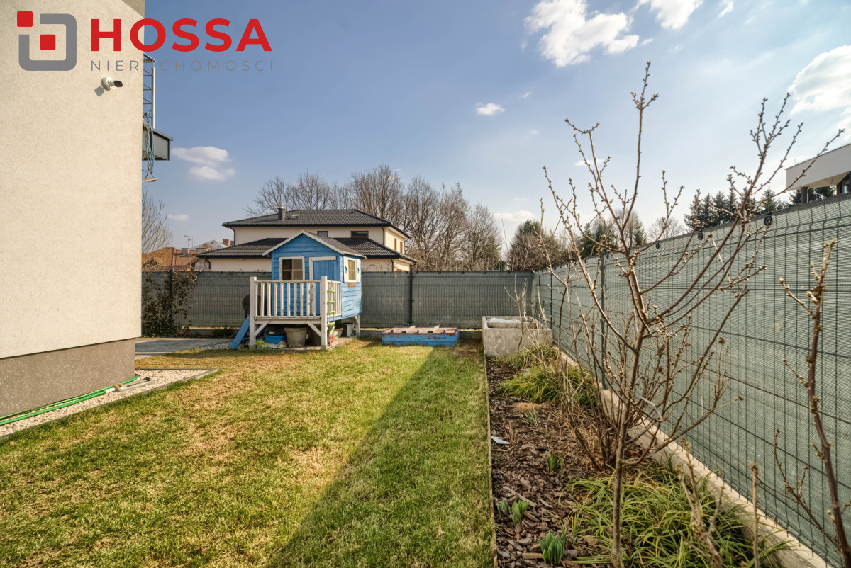 Ogród został funkcjonalnie zagospodarowany — znajduje się tu taras z kostki brukowej, podwyższona grządka, zamykana piaskownica, drewniany domek dla dzieci oraz dwa zbiorniki na deszczówkę. Przed domem dostępne są dwa miejsca parkingowe na ogrodzonym terenie oraz garaż współdzielony z sąsiadem.