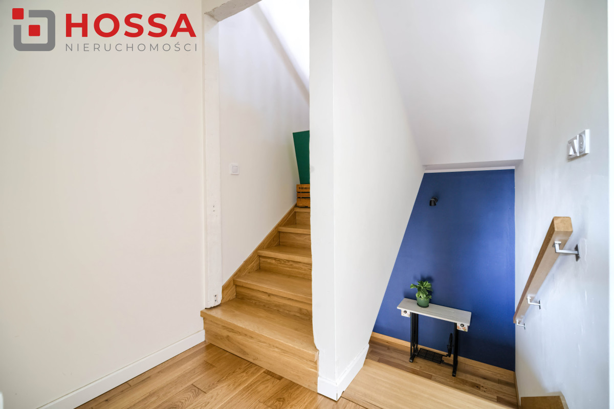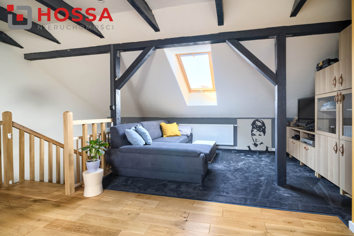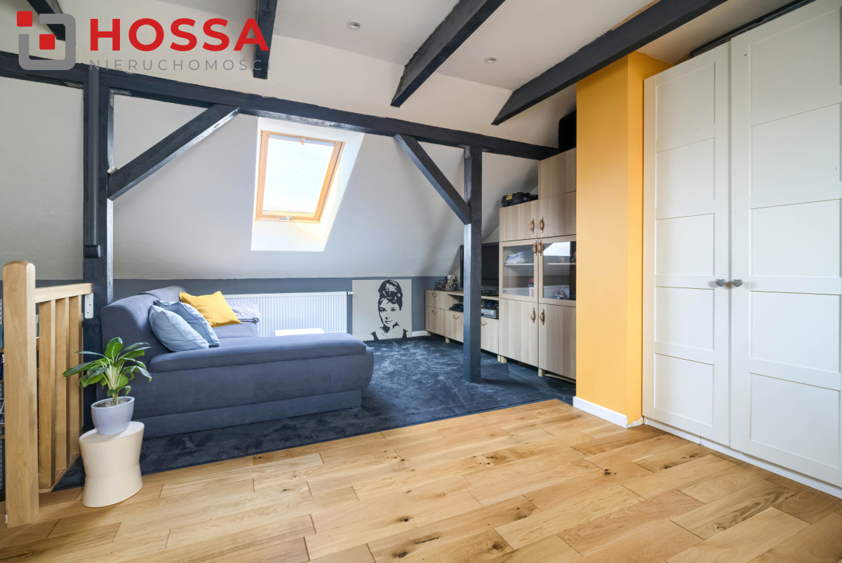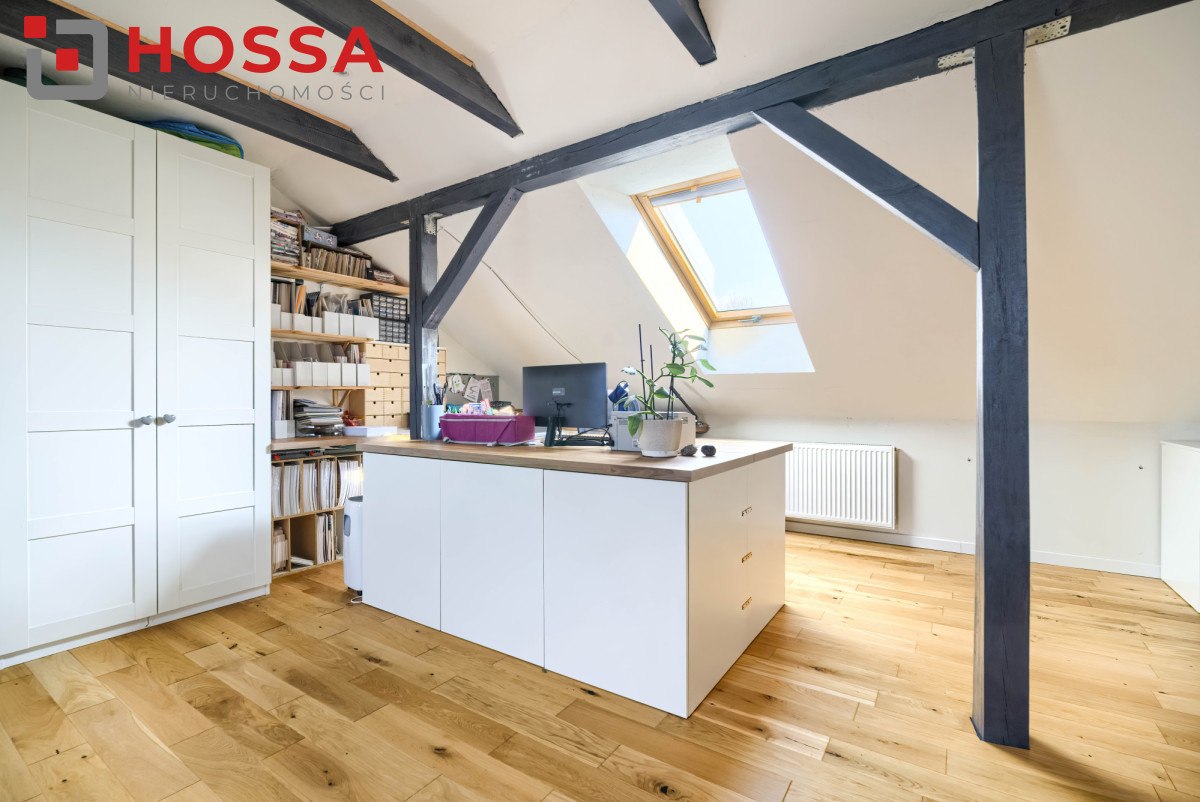 Poddasze użytkowe z klimatyzacją i widocznymi belkami stanowi dodatkową przestrzeń idealną na gabinet, sypialnię lub pokój hobby. Znajdują się tu również dwie duże szafy w zabudowie.