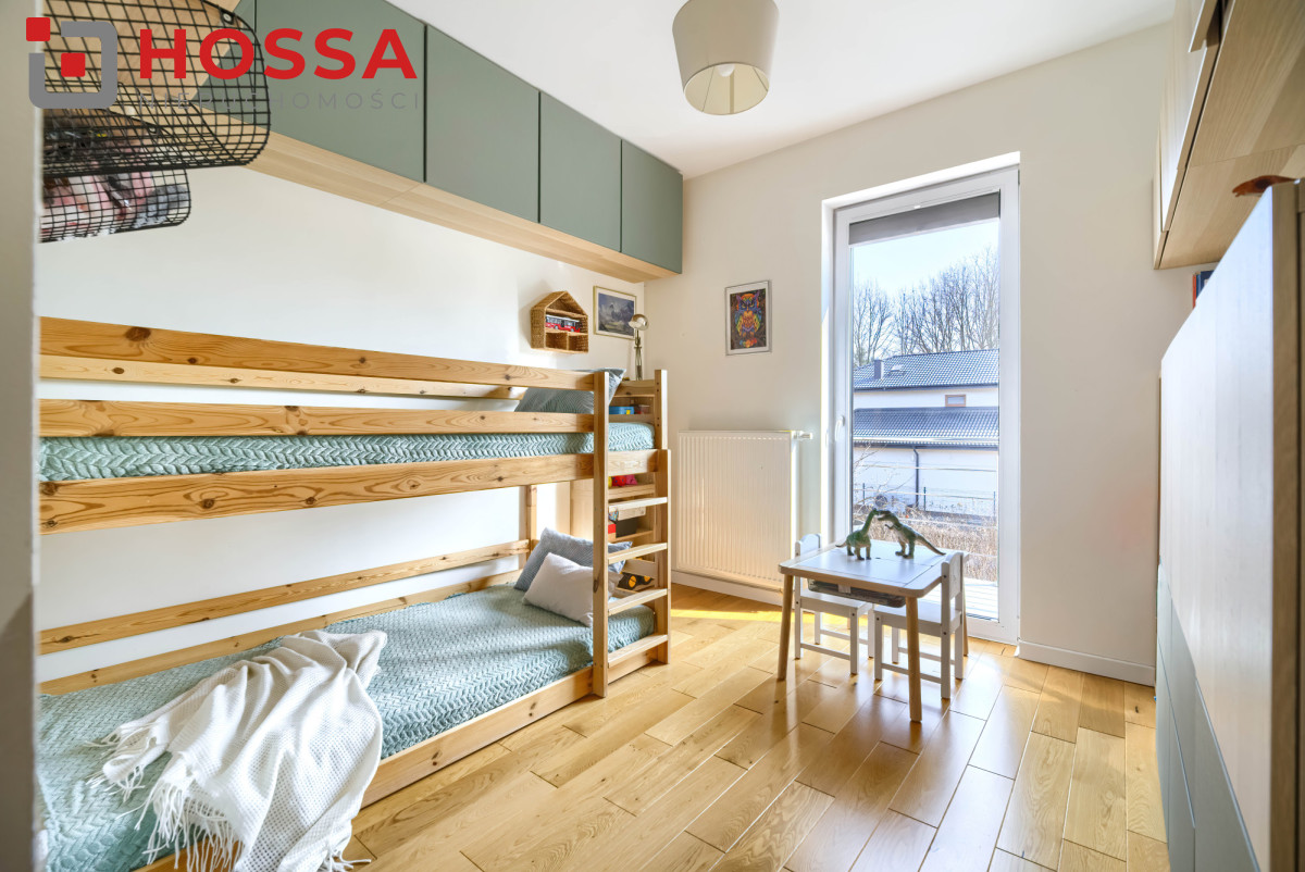 Piętro to strefa prywatna obejmująca trzy ustawne sypialnie, w tym dwie z wyjściem na balkon od strony ogrodu, oraz łazienkę z prysznicem typu walk-in i zabudową meblową. Na podłogach zastosowano naturalną deskę.