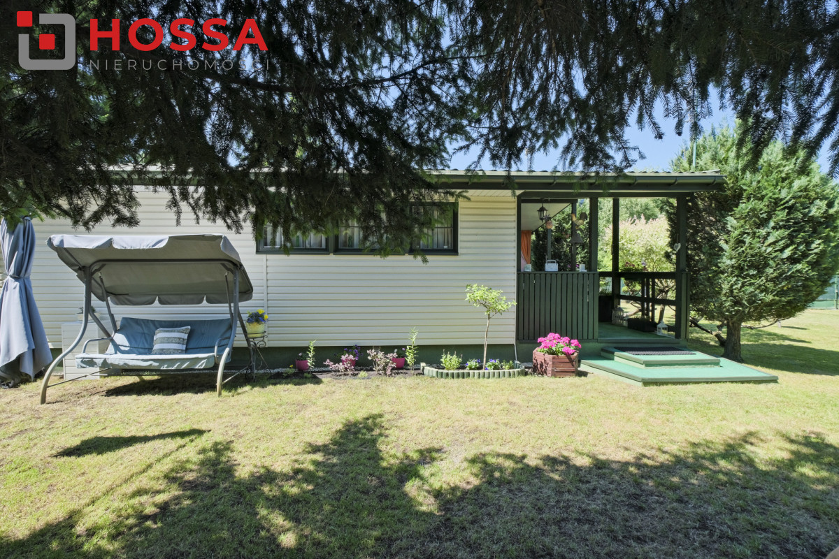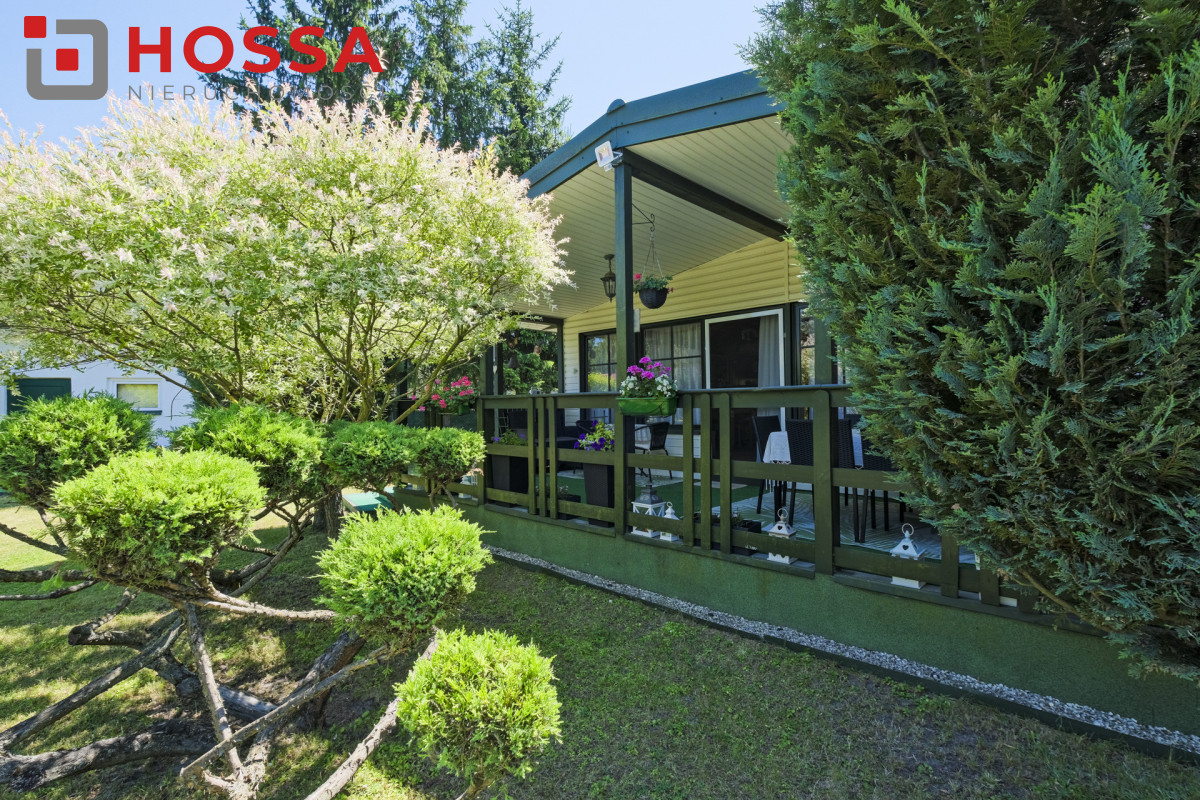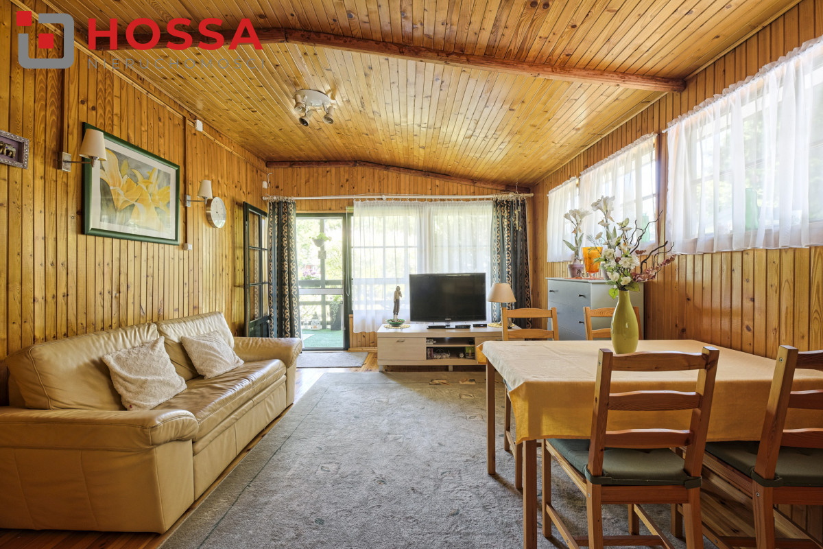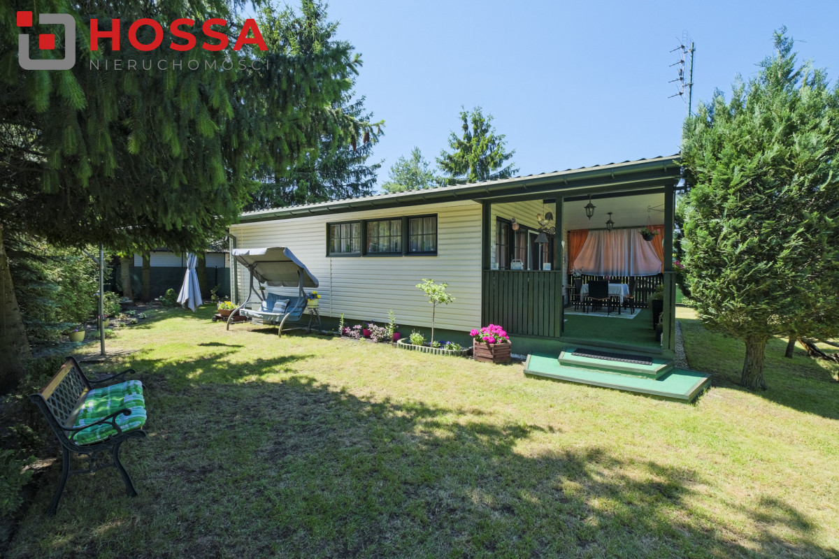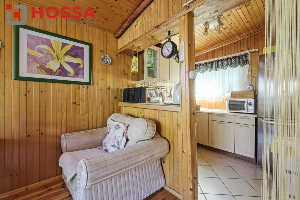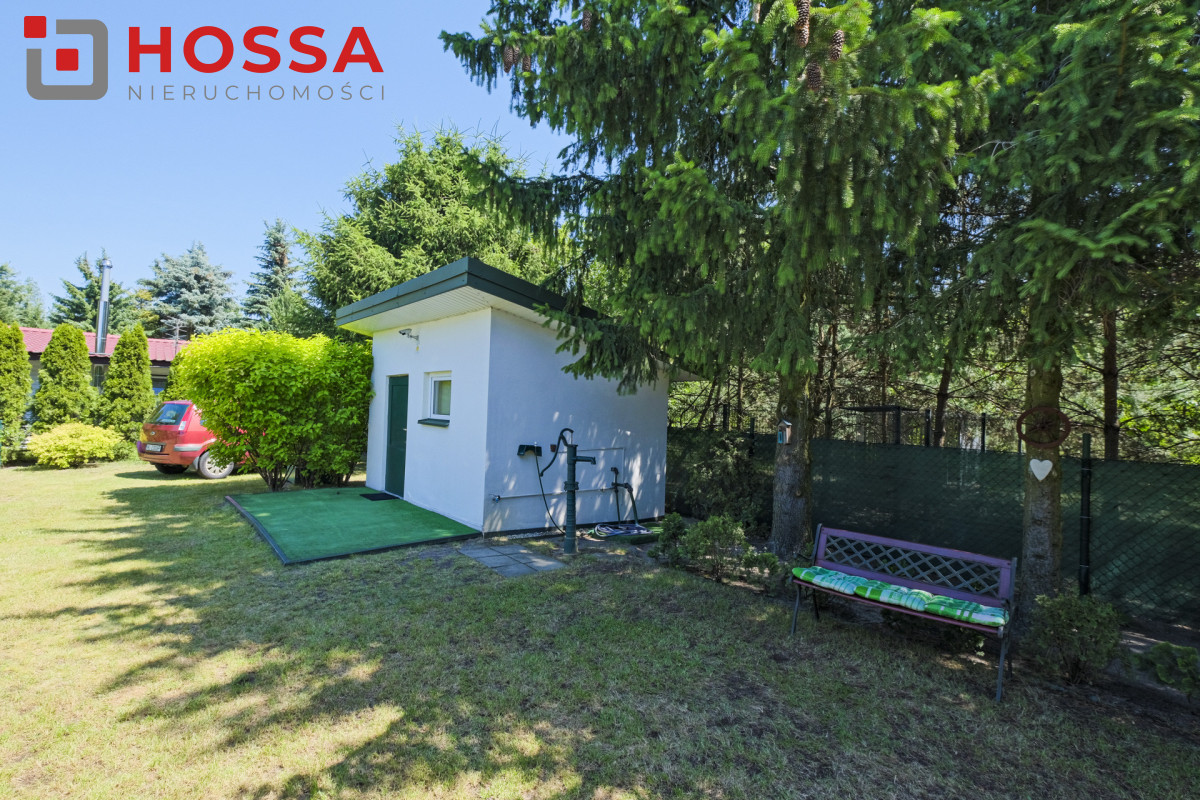 Działka jest w kształcie prostokąta, ma powierzchnię 820m2, jest zagospodarowana, z domkiem drewnianym o powierzchni użytkowej 50,30m2 oraz małym domkiem gospodarczym. Dodatkowym atutem jest duży zadaszony taras ok. 20m2.