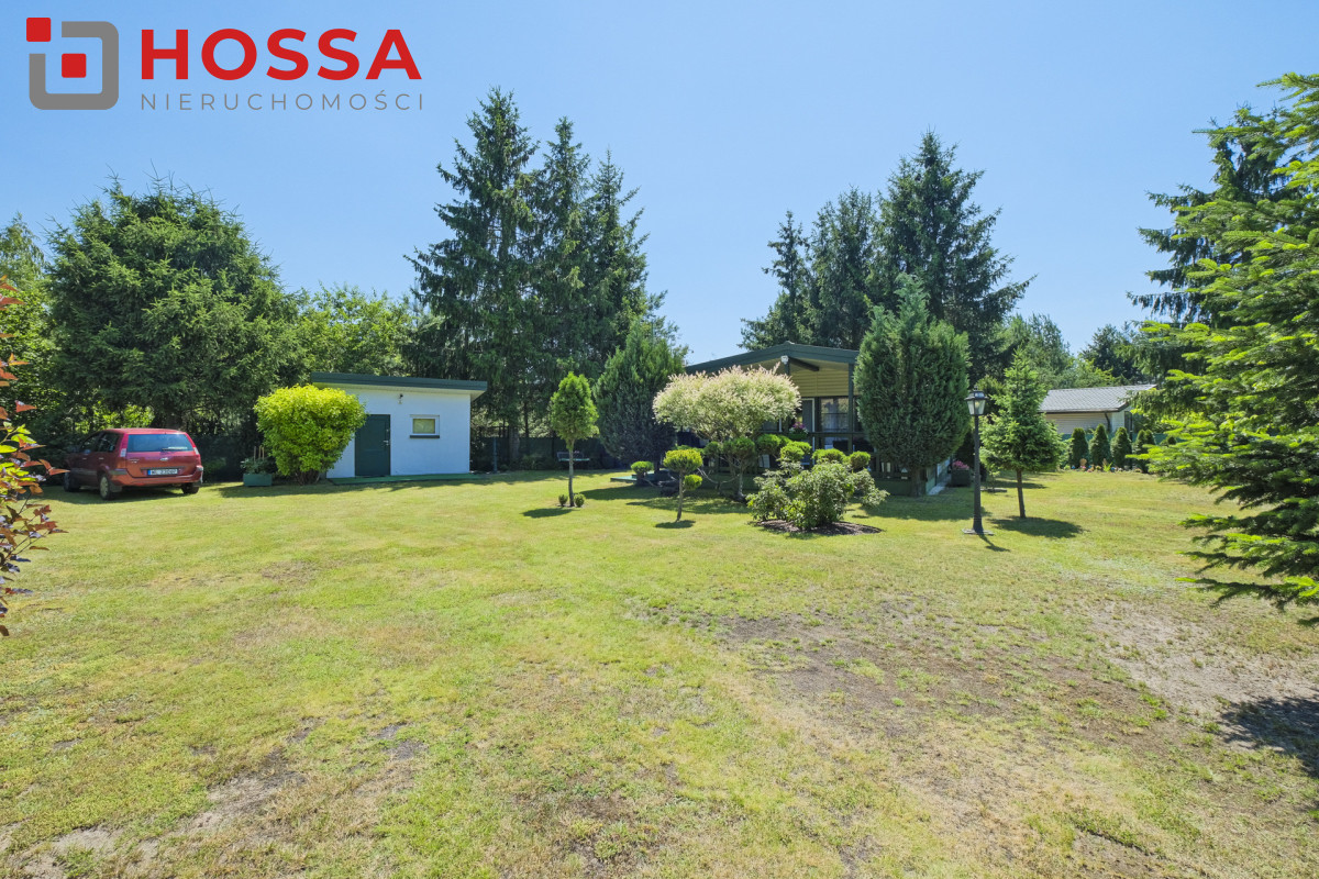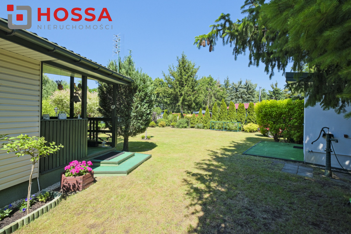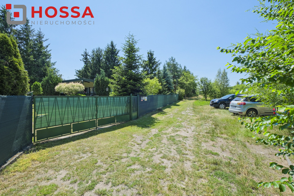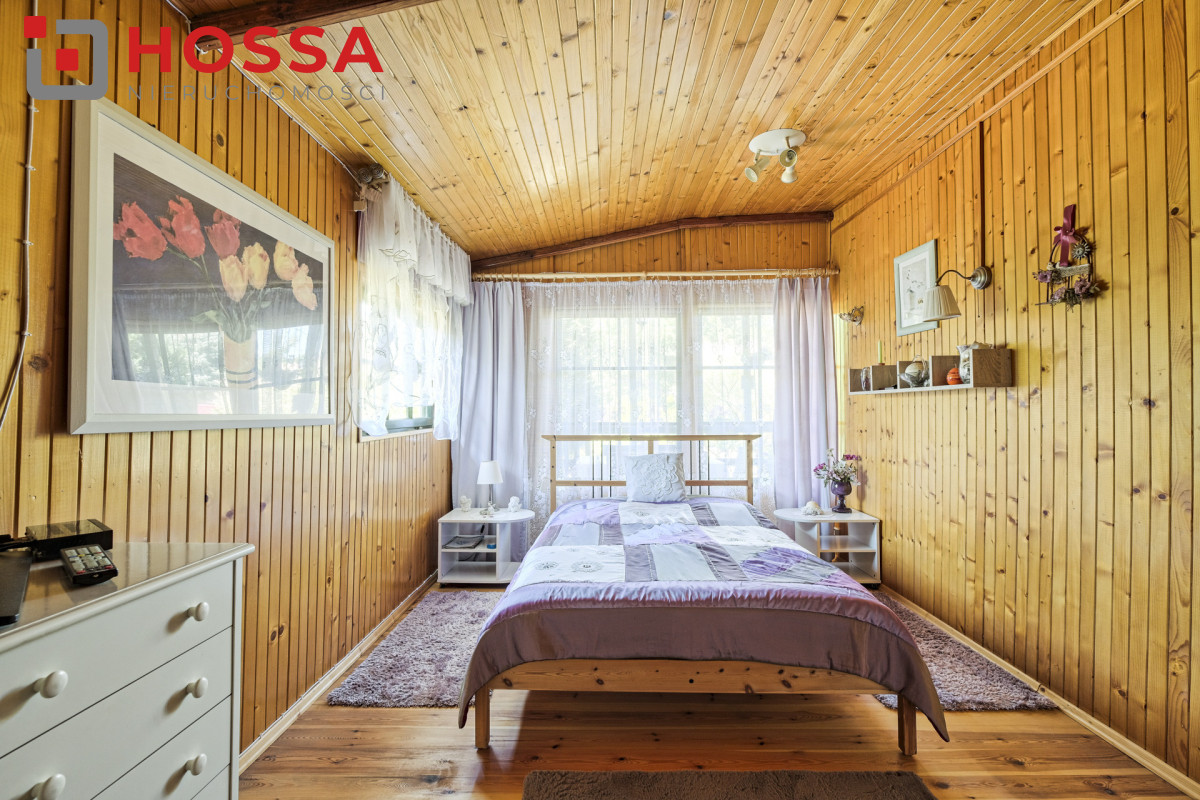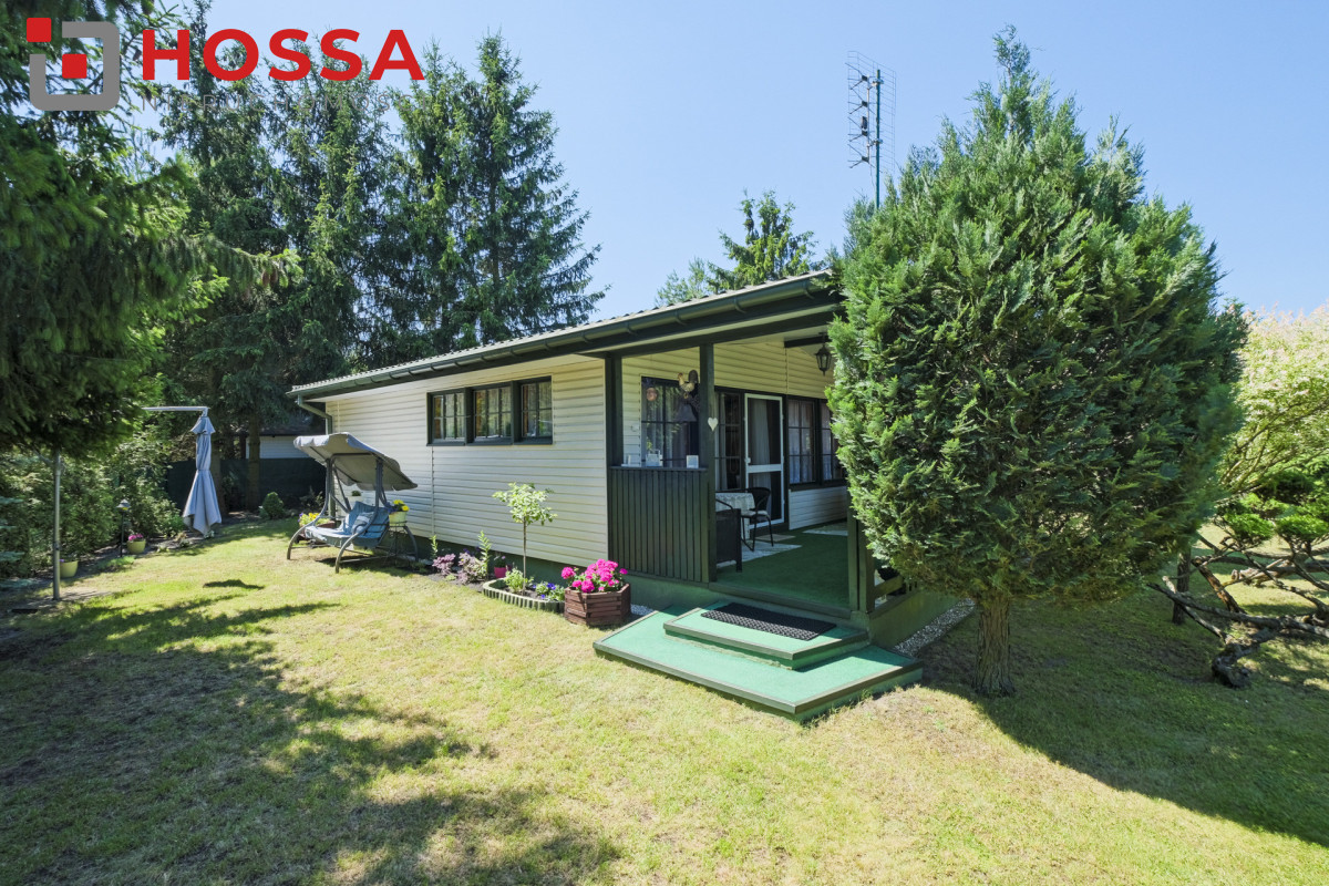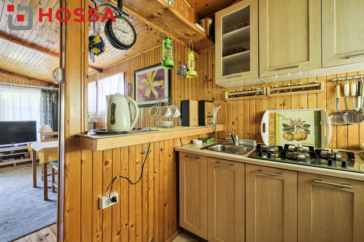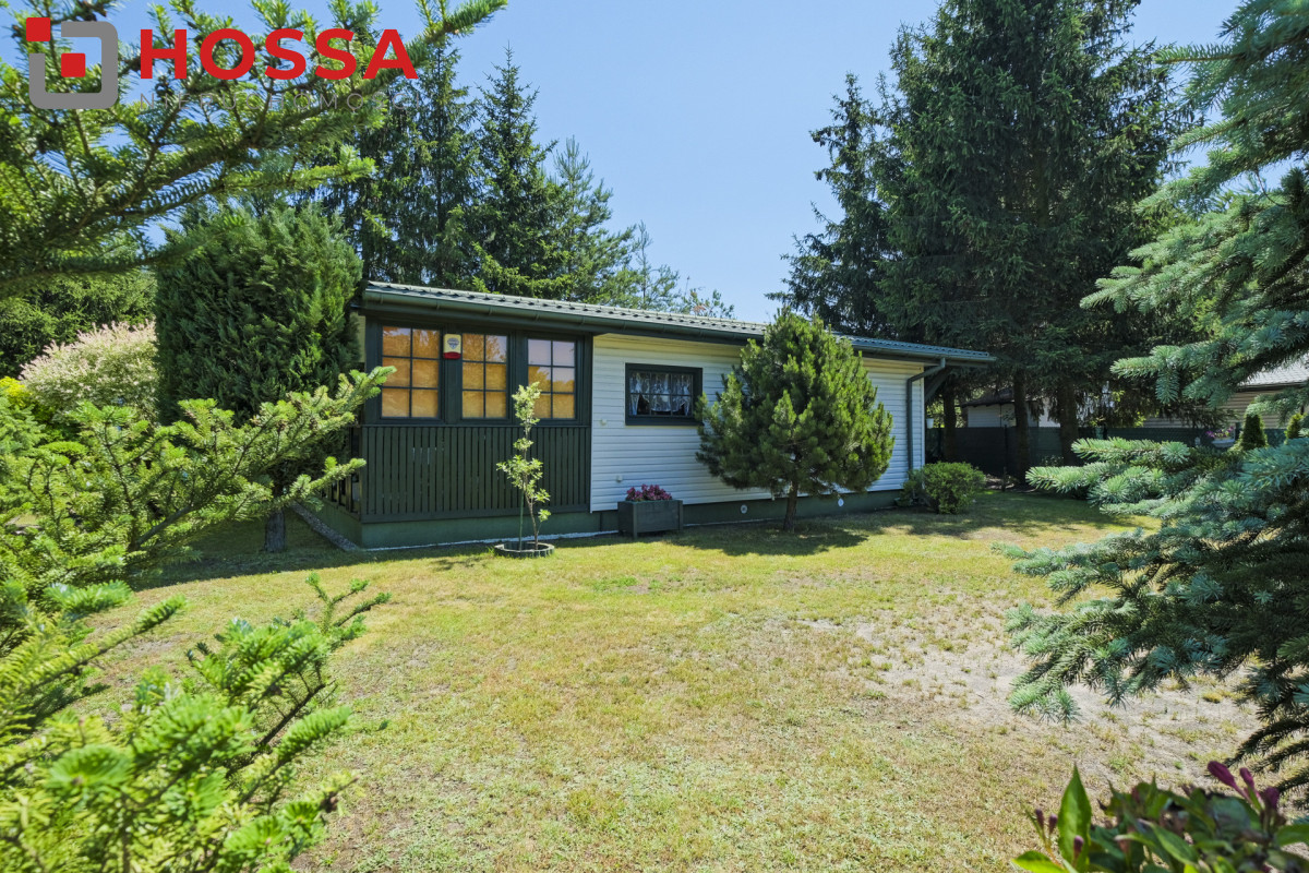 Działka jest w kształcie prostokąta, ma powierzchnię 820m2, jest zagospodarowana, z domkiem drewnianym o powierzchni użytkowej 50,30m2 oraz małym domkiem gospodarczym. Dodatkowym atutem jest duży zadaszony taras ok. 20m2.