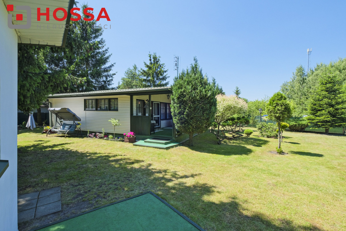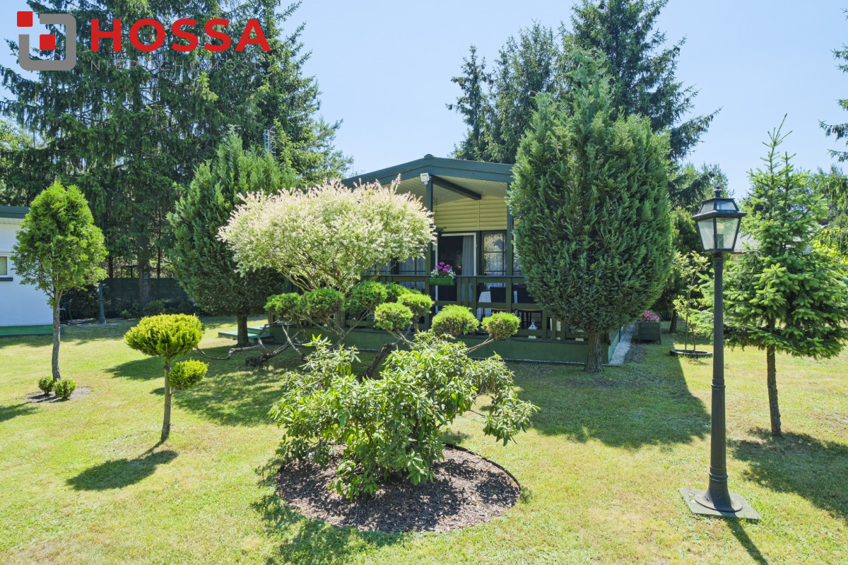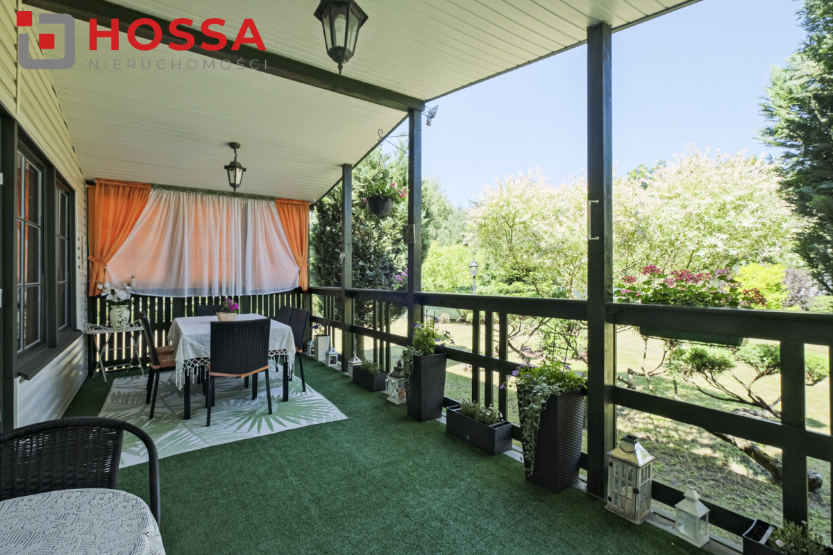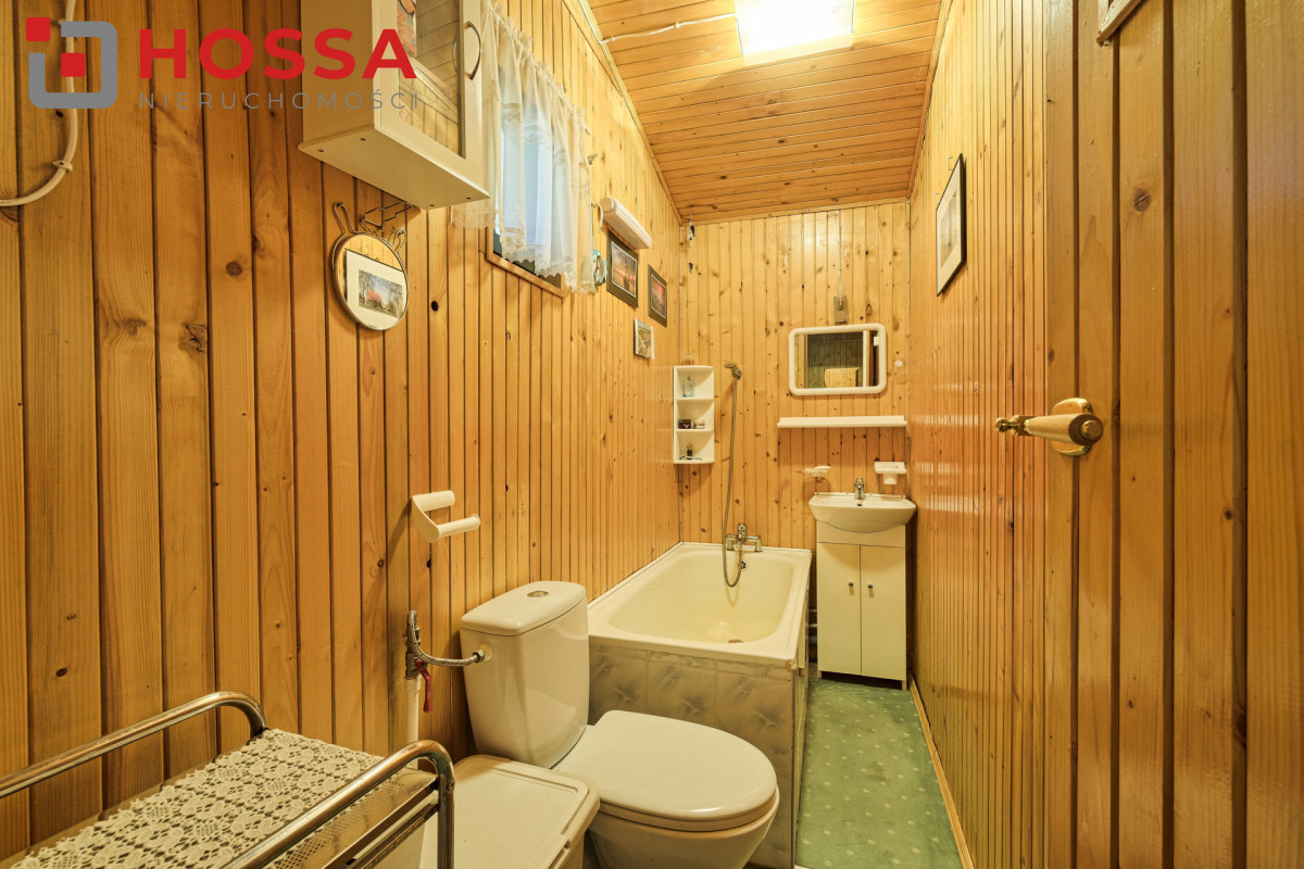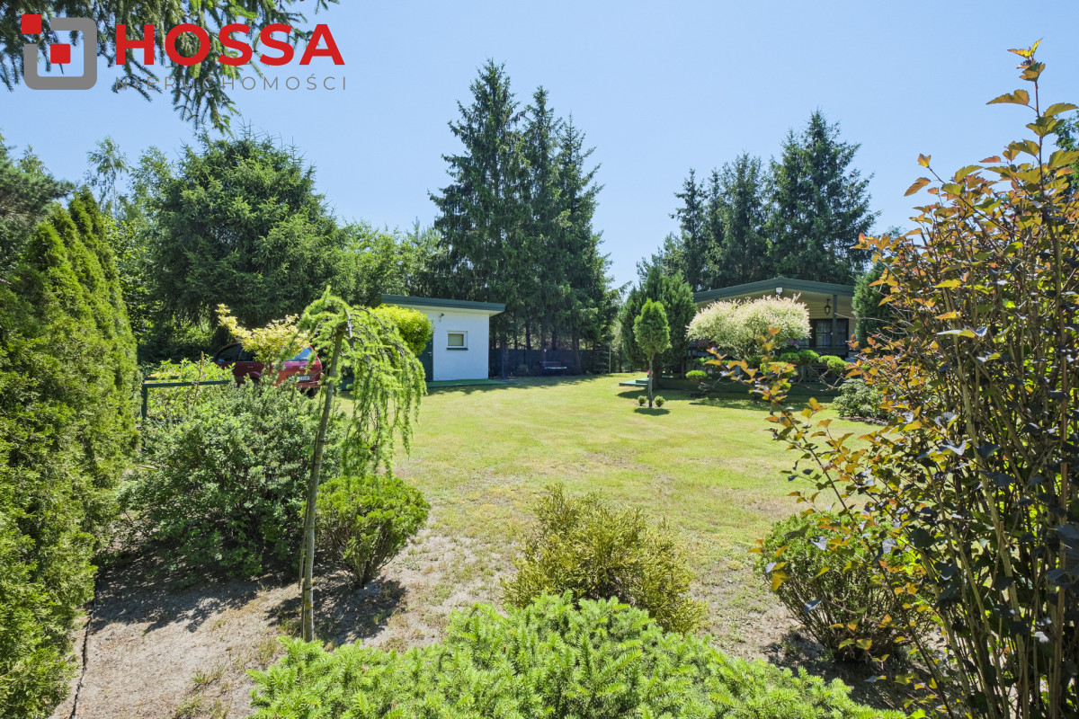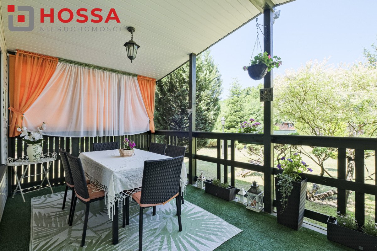 Działka jest w kształcie prostokąta, ma powierzchnię 820m2, jest zagospodarowana, z domkiem drewnianym o powierzchni użytkowej 50,30m2 oraz małym domkiem gospodarczym. Dodatkowym atutem jest duży zadaszony taras ok. 20m2.
