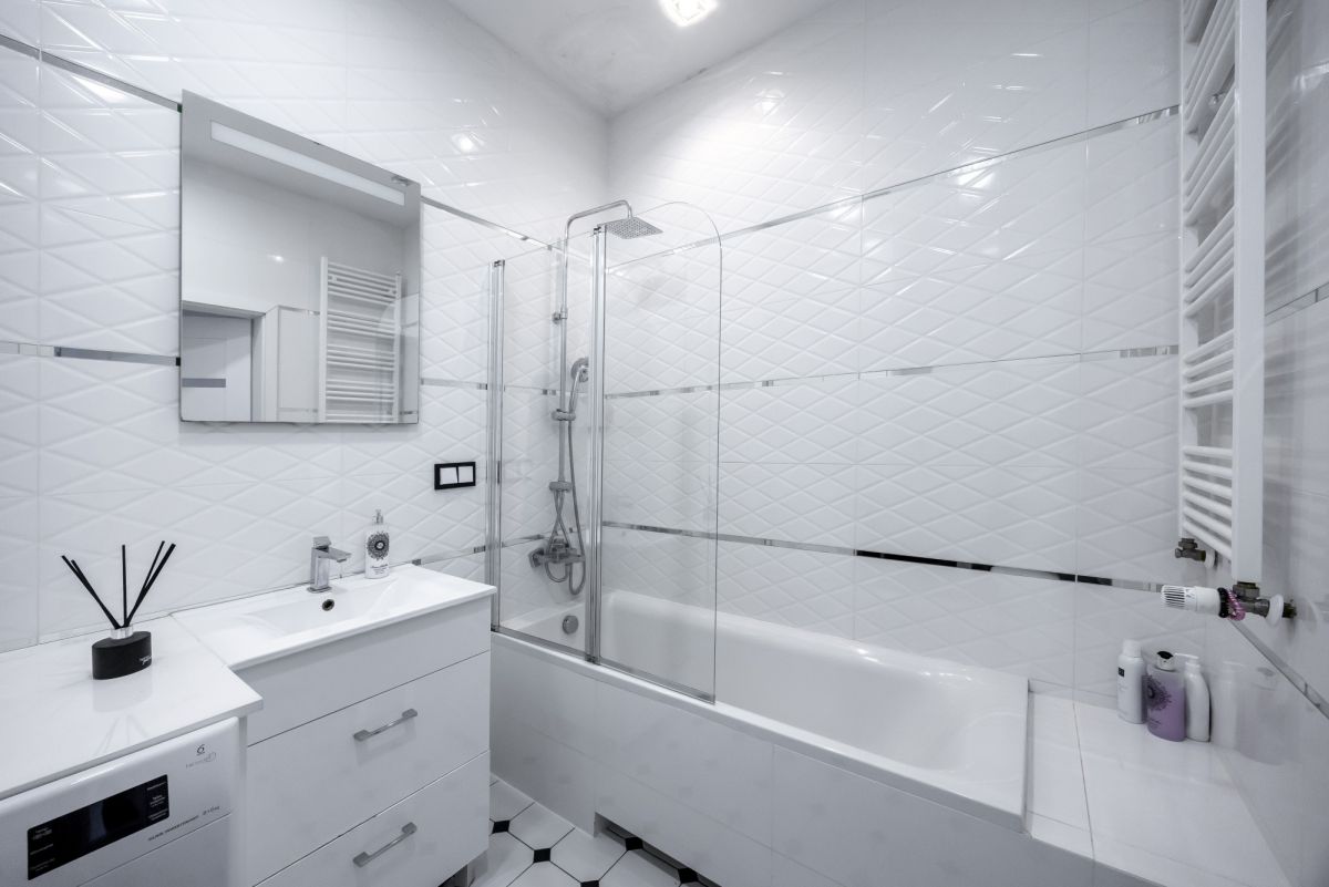 • Łazienka: Wykończona w jasnej kolorystyce, wyposażona w wygodną wannę.