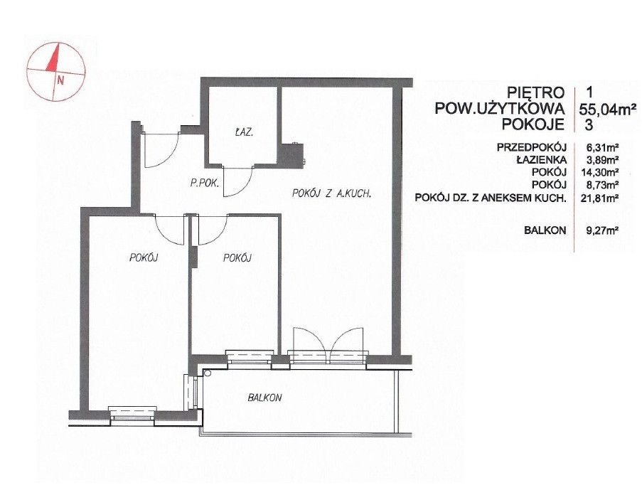 • salon z aneksem kuchennym oraz wyjściem na duży balkon o powierzchni 9m2