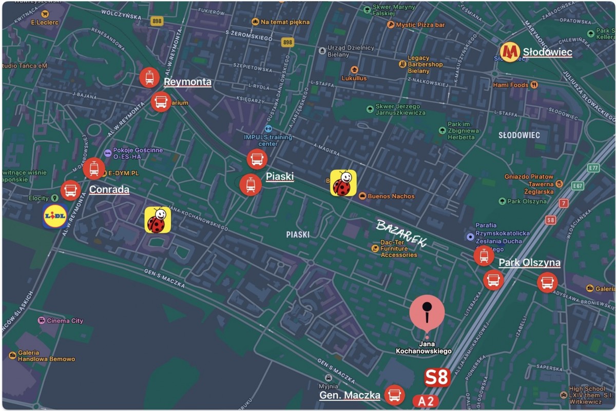 Budynek mieści się na spokojnym, zielonym osiedlu w pobliżu parku (Park Olszyna), a jednocześnie w miejscu doskonale skomunikowanym. W bliskim sąsiedztwie znajdują się liczne przystanki autobusowe i tramwajowe, a najbliższa stacja metra (M1 Słodowiec), oddalona jest od mieszkania o niecałe 1,5 km. Nieopodal wjazd na Aleję Prymasa Tysiąclecia oraz trasę S8, co znacznie usprawnia poruszanie się autem po mieście i jego okolicach.