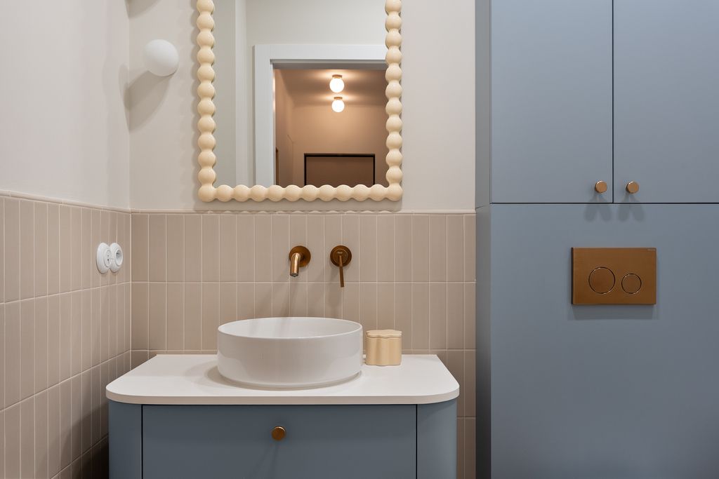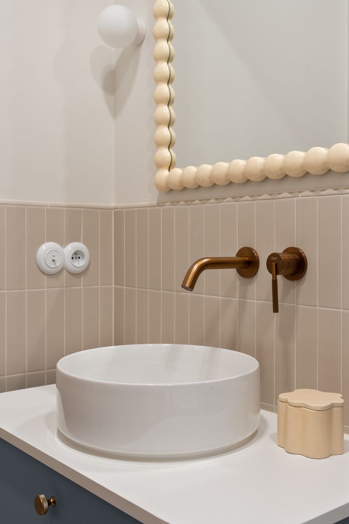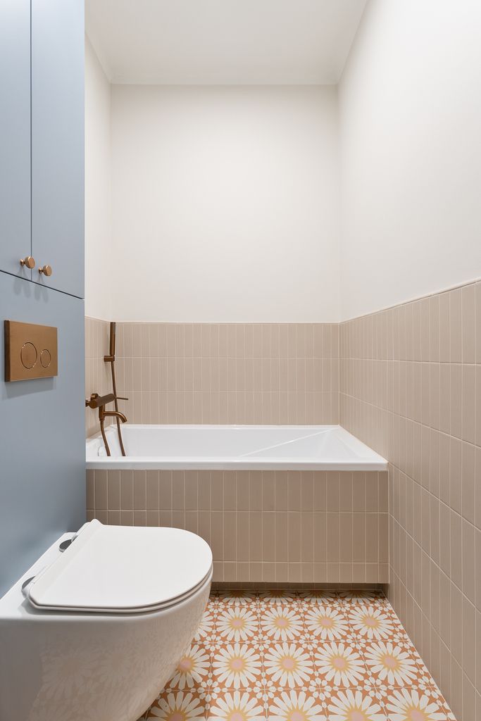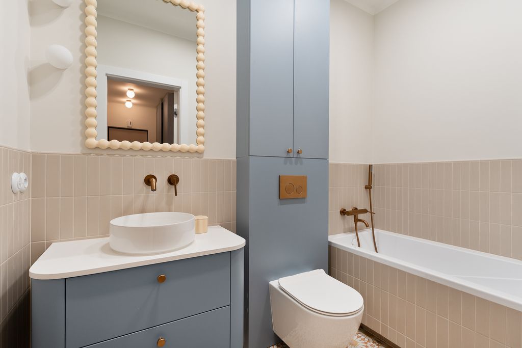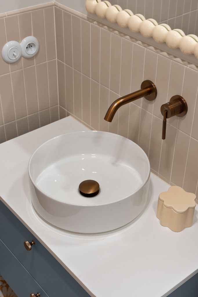 - Łazienka z wanną, stylową armaturą w kolorze miedzi