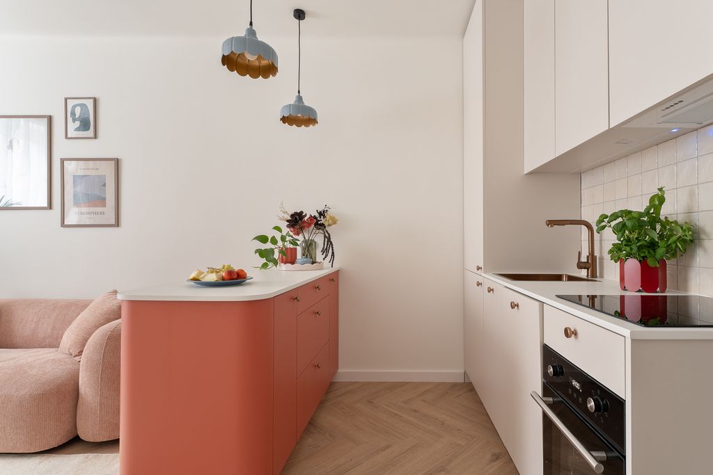 - Sprzęt AGD: lodówka z zamrażarką, zmywarka, płyta indukcyjna, piekarnik, okap