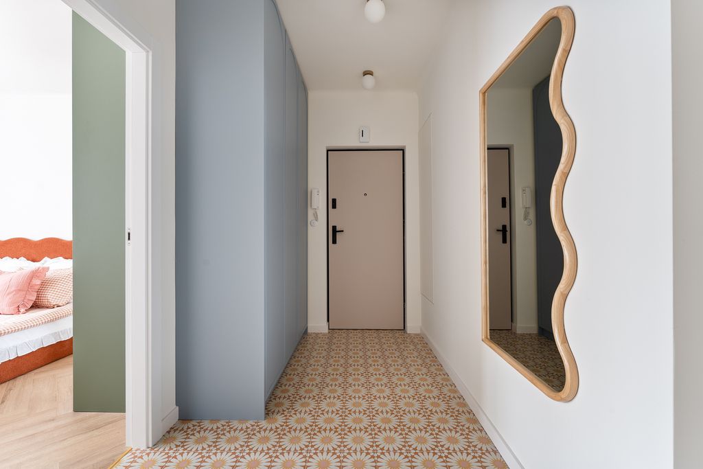 - Duży przedpokój z trzydrzwiową szafą w zabudowie