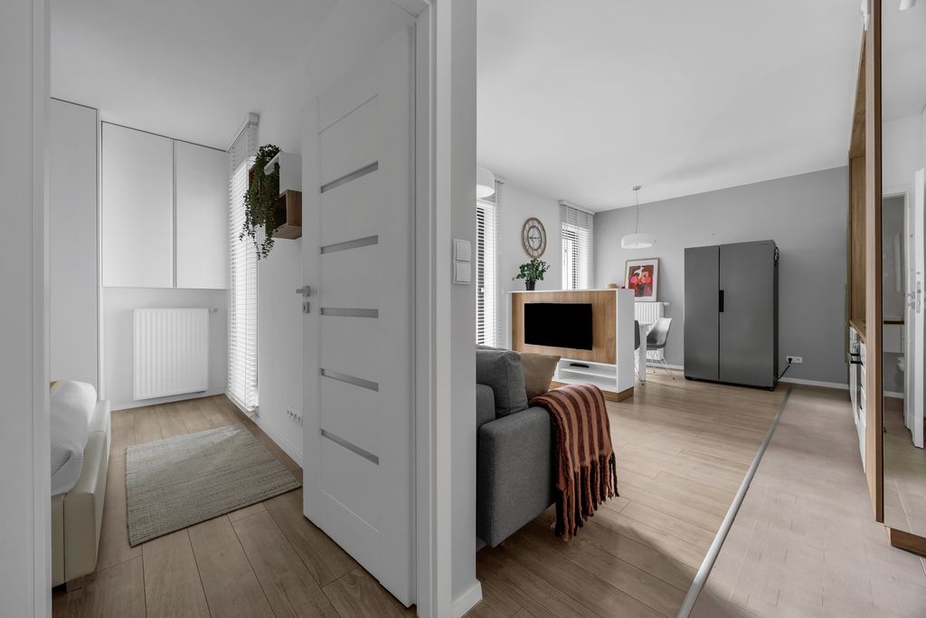 Salon z aneksem kuchennym (17,69 m²) to jasna, ustawna przestrzeń z miejscem na strefę wypoczynkową i jadalnianą. Aneks kuchenny wykonany w zabudowie i w pełni wyposażony pozwala na wygodne, codzienne użytkowanie bez kompromisów.