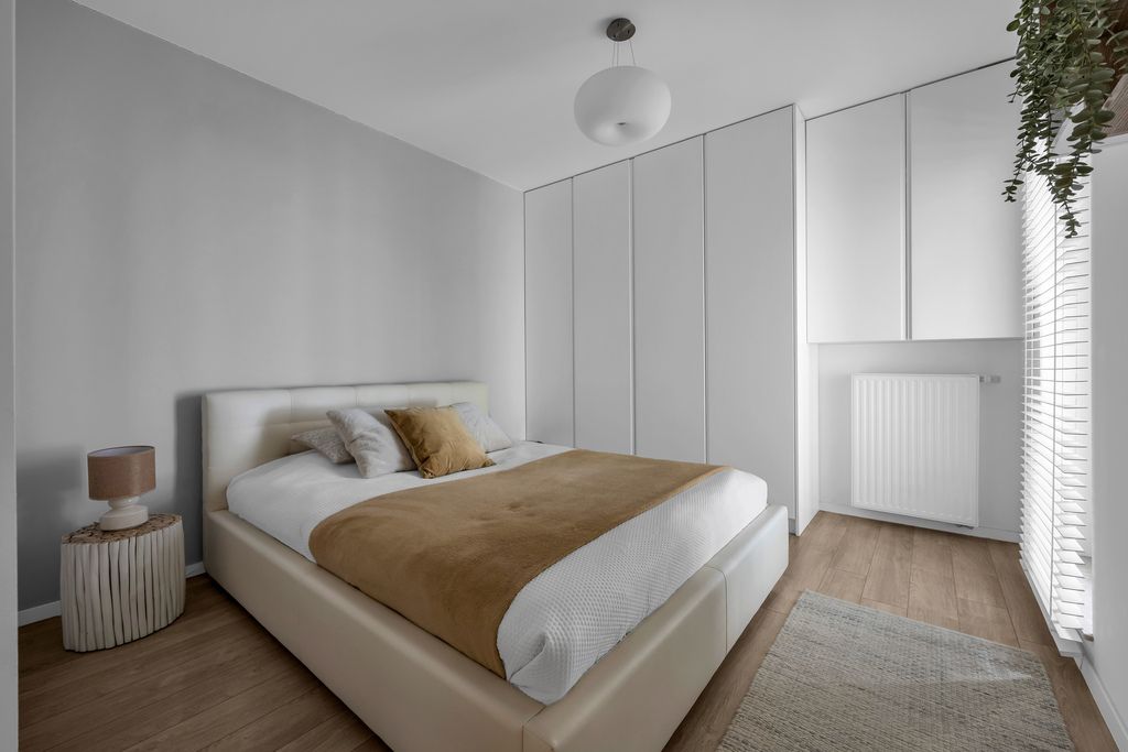 Sypialnia (11,68 m²) to komfortowa przestrzeń do odpoczynku – z dużą szafą w zabudowie oraz łóżkiem 160x200 ze schowkiem, co znacząco zwiększa możliwości przechowywania.