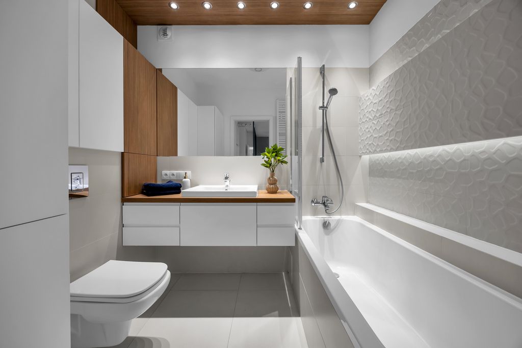 Łazienka (4,8 m²) z dużą wanną i parawanem prysznicowym to rozwiązanie praktyczne zarówno na szybki poranek, jak i spokojny wieczór. Zabudowane meble i pralka tworzą spójną, estetyczną całość.