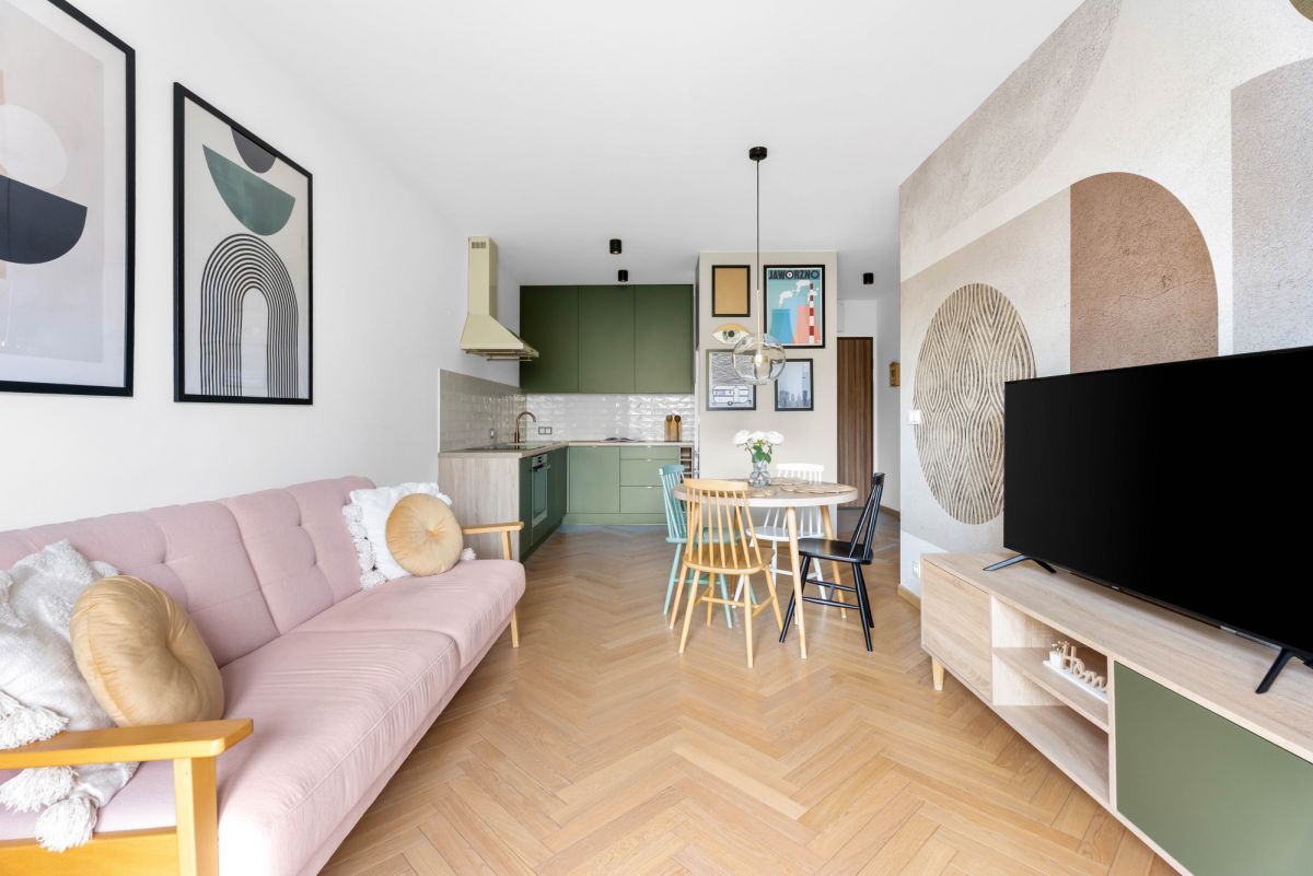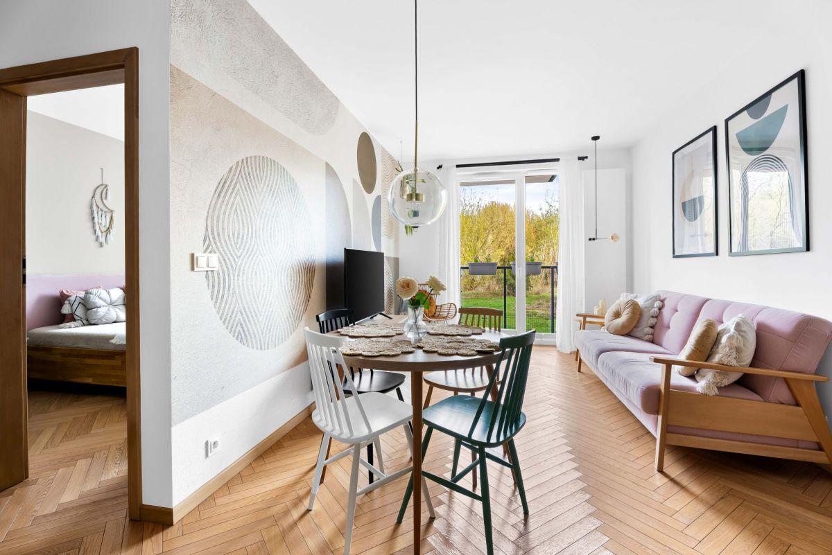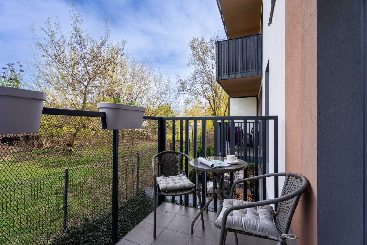jasny salon z wyjściem na przestronny balkon (3,75m2) - idealny na poranną kawę w otoczeniu zieleni