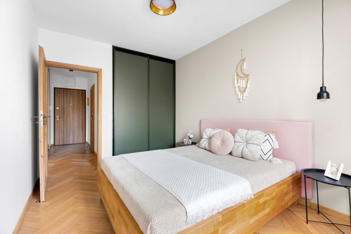 komfortowa sypialnia z pojemną szafą w zabudowie, łóżkiem (160x200) z pojemnikiem i wygodnym materacem