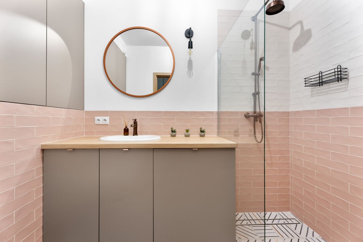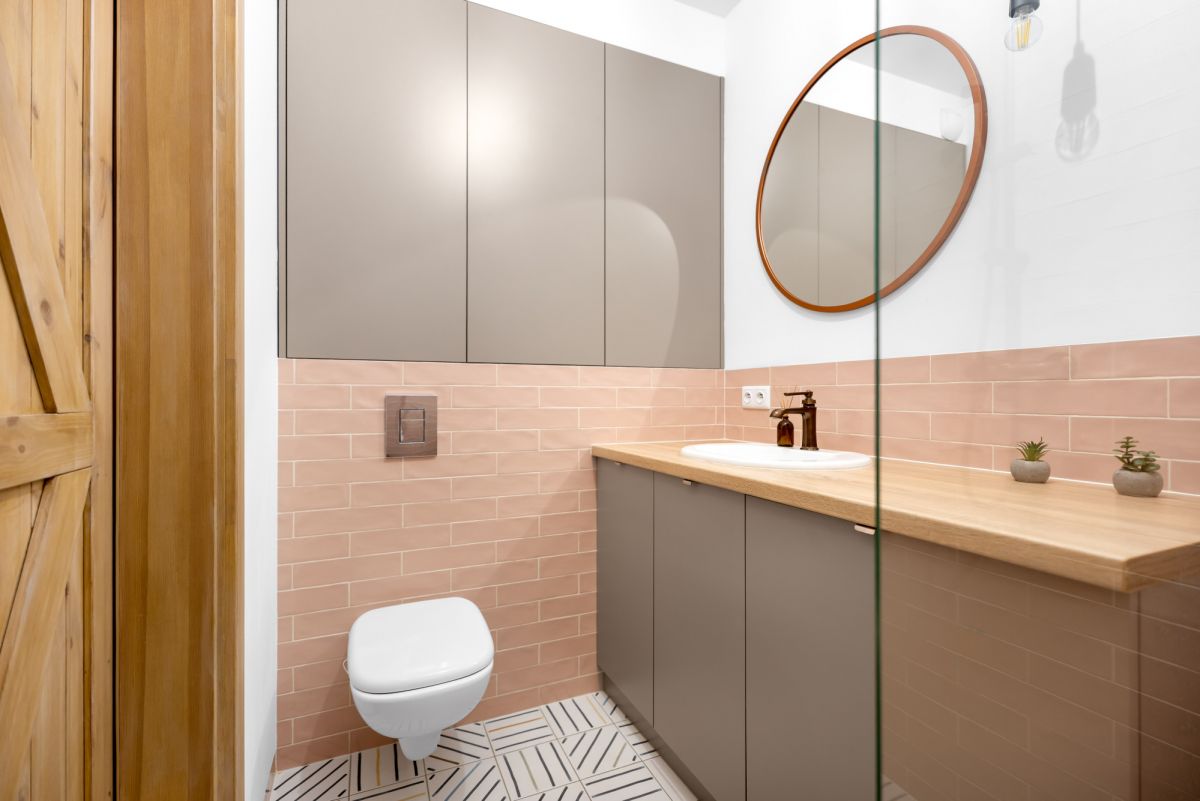 elegancka łazienka z prysznicem walk- in, wc, szafkami w zabudowie i pralką