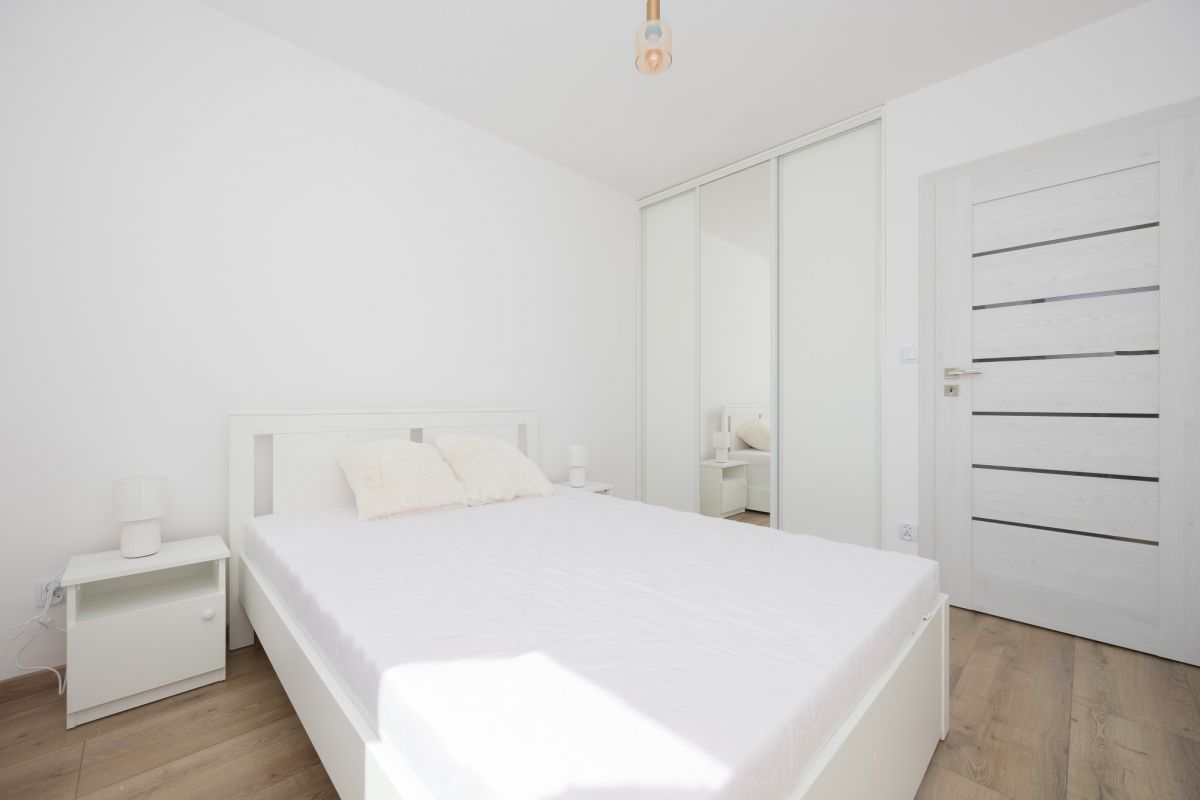 W sypialni znajduje się duże łóżko, szafki nocne oraz pojemna szafa z lustrem.
