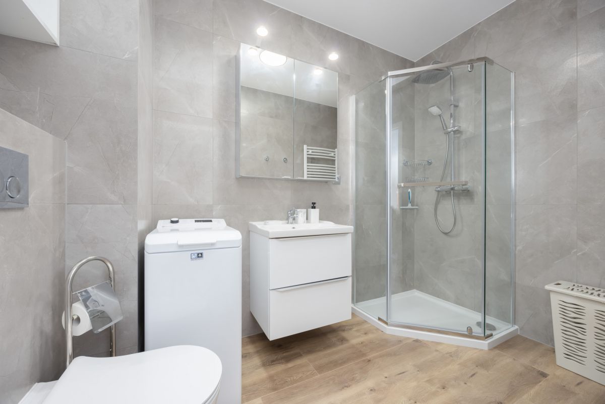 Łazienka została funkcjonalnie zaprojektowana - do dyspozycji najemcy jest umywalka z szafką podblatową, podświetlana szafka lustrzana, dodatkowa szafka wisząca, toaleta, pralka oraz kabina prysznicowa z deszczownią.