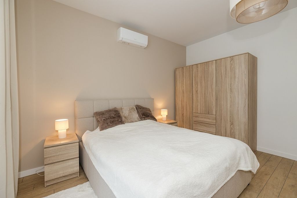 - sypialnia z łóżkiem, szafkami nocnymi, komodą i szafą oraz niezależną klimatyzacją.