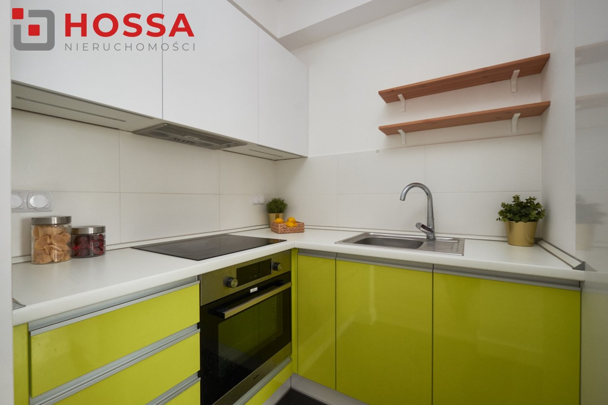 Kuchnia oraz łazienka wyposażone zostały w meble oraz niezbędny sprzęt AGD (pralka, lodówka, zmywarka). W przedpokoju znajduje się pojemna szafa.
