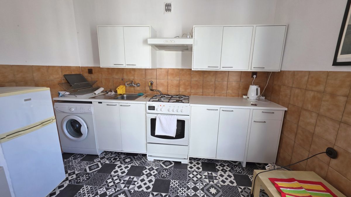 - kuchni bez okna otwartej na salon, wyposażonej w zabudowę szafkową, lodówkę, pralkę, kuchenkę gazowo/elektryczną, w części jadalnej stołu z krzesłami,