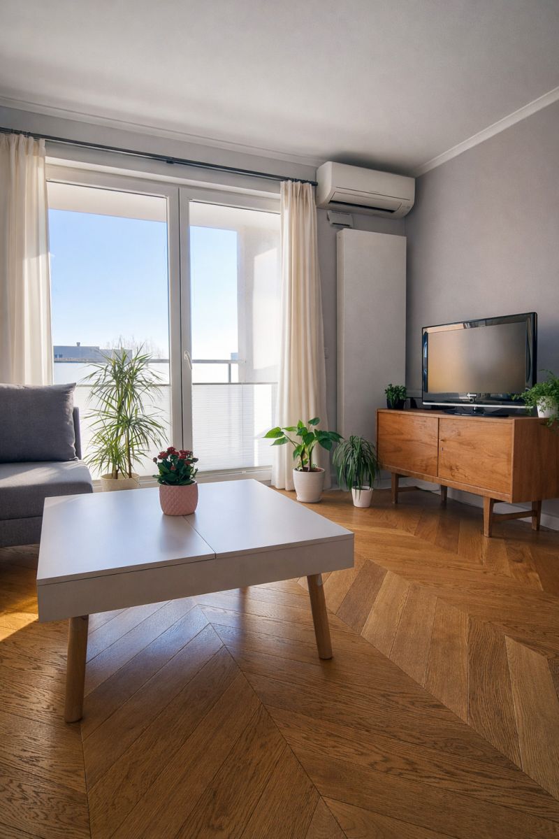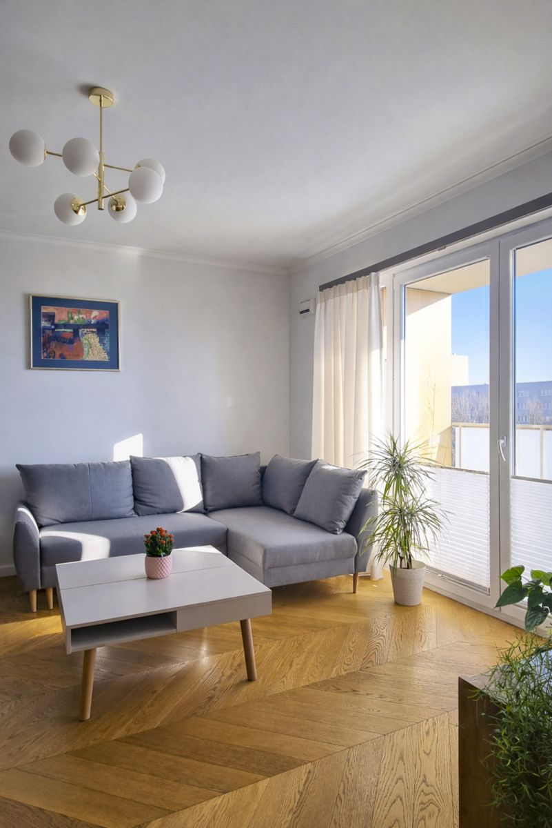 Dobre doświetlenie zapewniają duże okna oraz wschodnia ekspozycja. W upalne dni temperaturę wewnątrz chłodzi klimatyzacja. Mieszkanie znajduje się na ostatnim 5 piętrze. Dzięki temu oraz dobrej akustyce jest w nim stosunkowo cicho. Z przestronnego balkonu rozpościera się widok na klasyczny Ursynów.