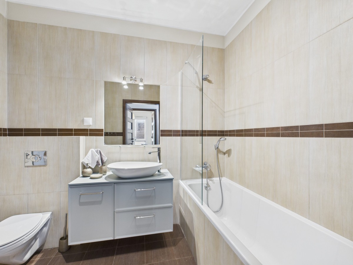 dwie łazienki: jedna z prysznicem, druga z wanną.