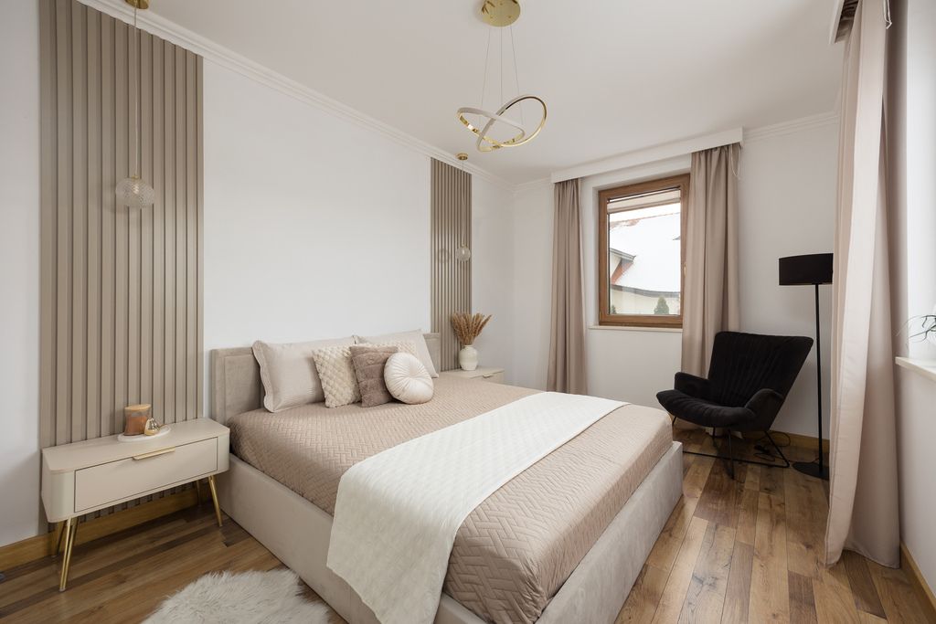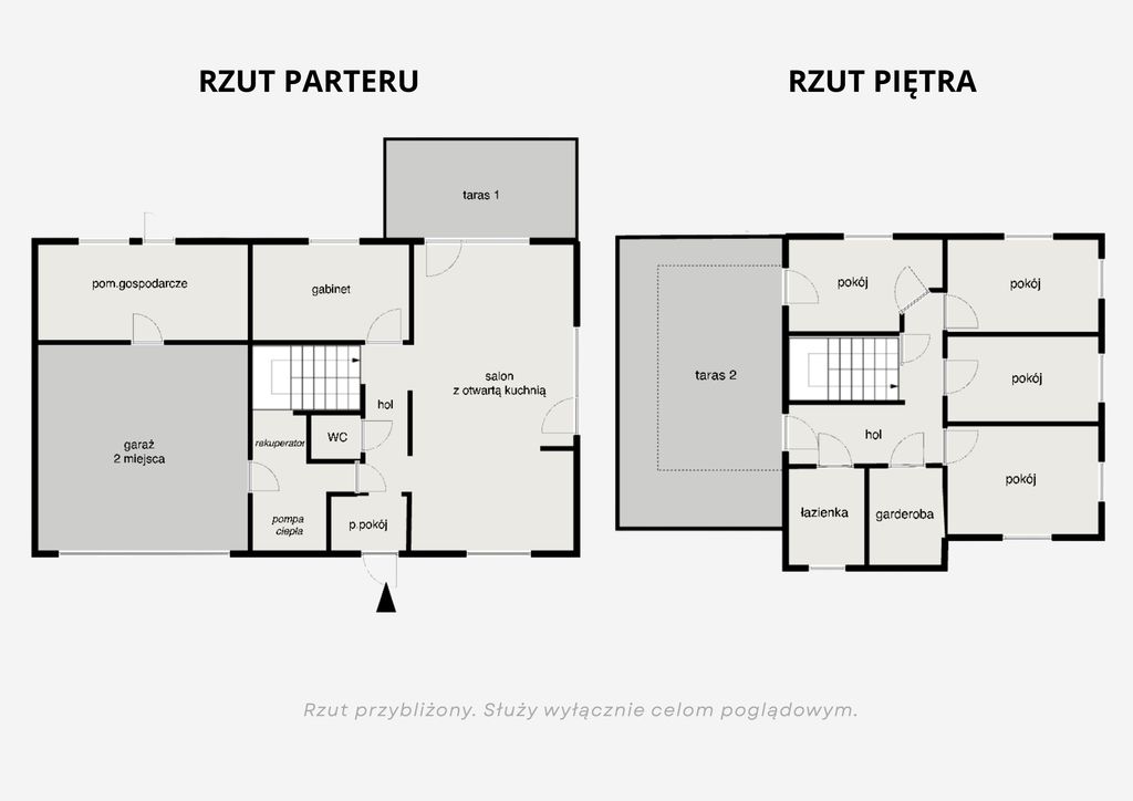 Na parterze znajduje się przestronny salon z otwartą kuchnią, który dzięki ekspozycji na południe i wschód jest doskonale doświetlony przez cały dzień. Z salonu prowadzi bezpośrednie wyjście na ogród oraz taras z drewnianą pergolą. Na tej kondygnacji znajduje się również dodatkowy pokój mogący pełnić funkcję gabinetu lub sypialni, a także toaleta, hol komunikacyjny, pomieszczenie techniczne z pompą ciepła i rekuperacją, pomieszczenie gospodarcze oraz garaż na dwa samochody.