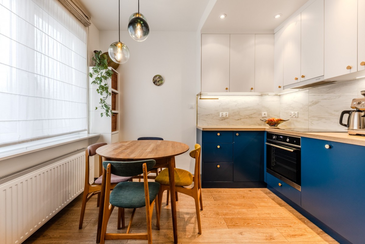 Aneks kuchenny wykonany na zamówienie przez stolarza — meble w zabudowie, nowoczesny sprzęt AGD, w tym zmywarka, piekarnik, płyta grzewcza, lodówka oraz system filtracji wody Aquaphor.