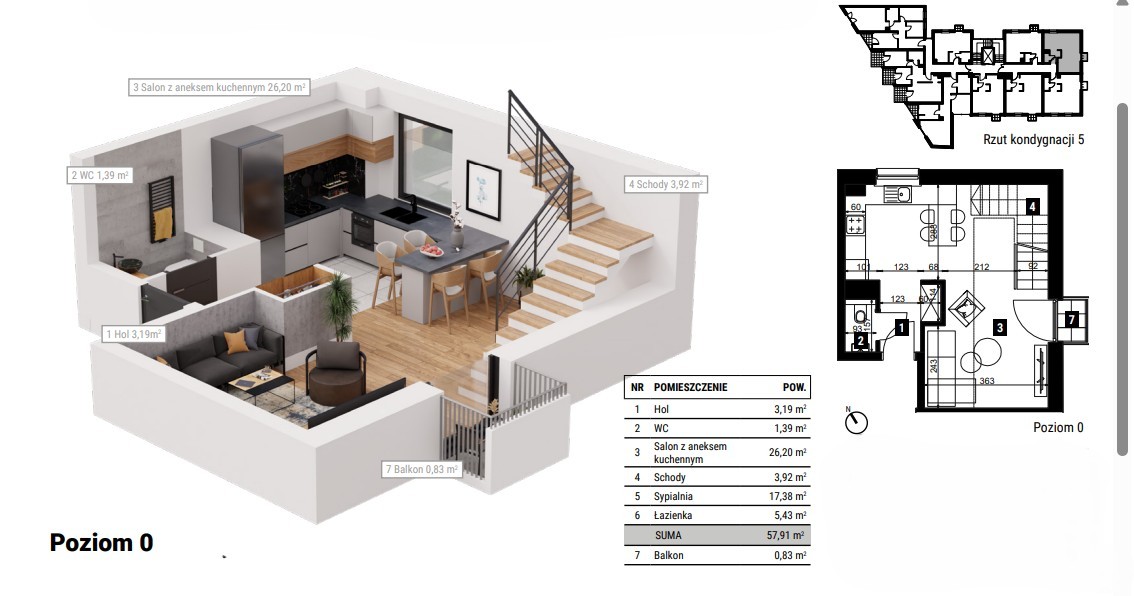 Na dolnym poziomie - przestronny salon z aneksem kuchennym, hall i WC.