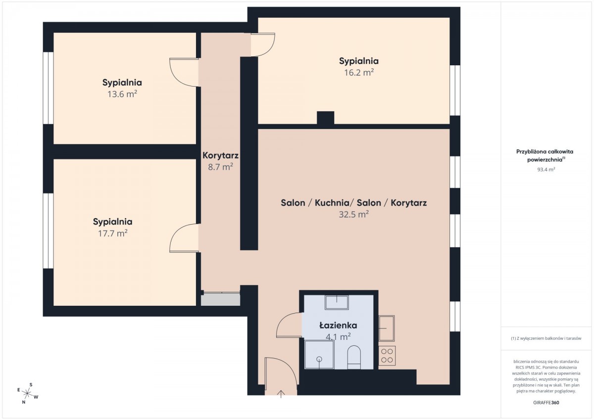 Dwustronny układ z trzema niezależnymi sypialniami oraz dużą strefą dzienną z kuchnią tworzy miejsce dla osób, które cenią przestrzeń, funkcjonalność i swobodę. Mieszkanie jest zadbane i gotowe do zamieszkania, oferując ok. 94 m² rzeczywistej powierzchni użytkowej (w KW 80,3 m² - wg starych norm).